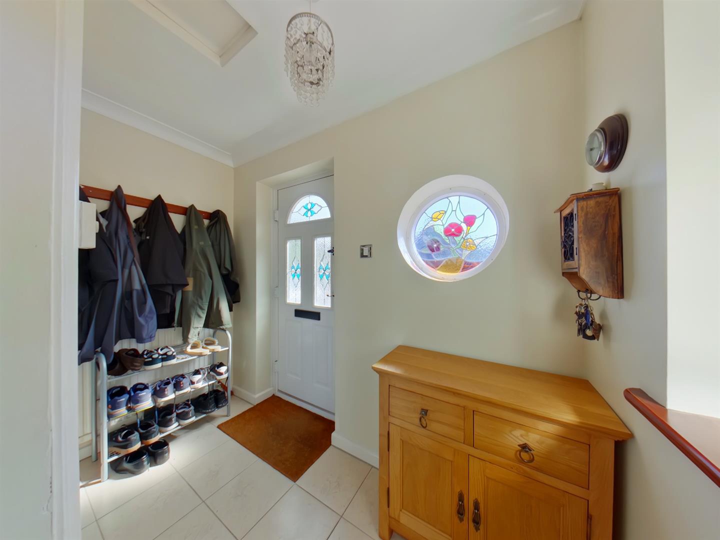 Entrance Porch - 2.59 x 1.23 (8'5" x 4'0") - Accessed via a composite front door, feature stained glass port hole window to front elevation, further window to side elevation, ceramic tiled floor radiator, doors into Annexe Kitchen and Entrance Hallway of the main house.