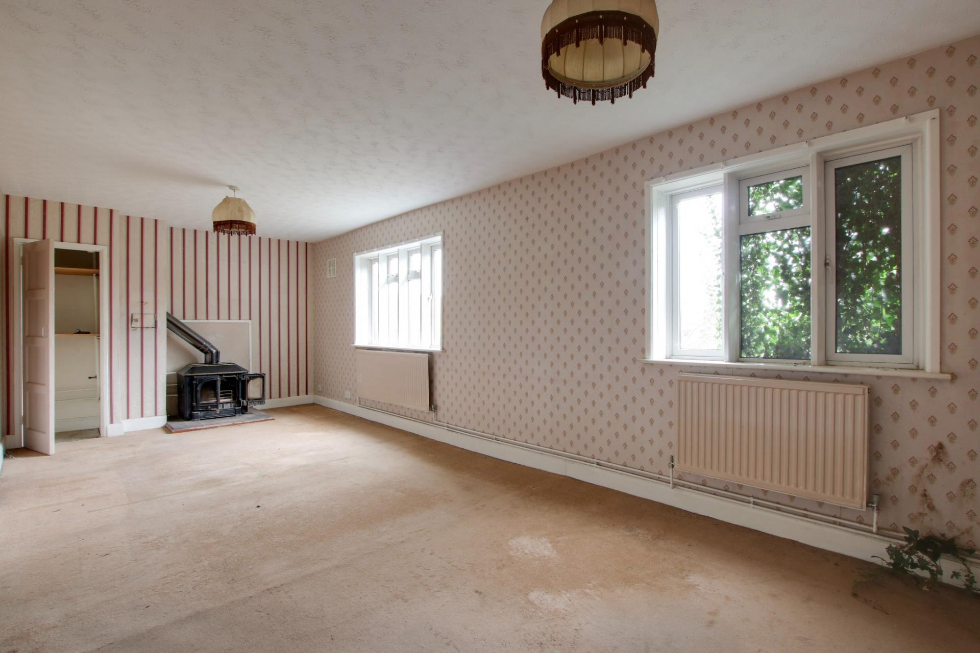 Two double glazed windows to rear elevation. 'Parquet Chilton' multi-fuel stove. Storage cupboard. Two radiators. Door to: