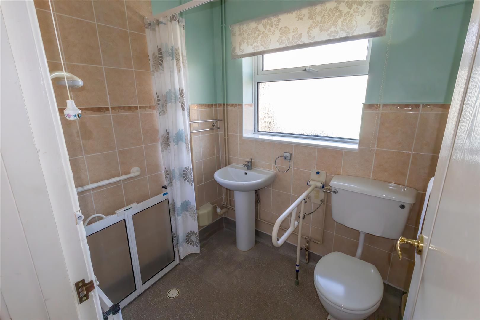 Wetroom - 1.855 x 1.648 (6'1" x 5'4") - Textured ceiling, window to side elevation, W.C, pedestal wash basin, electric shower and wet room floor, radiator.