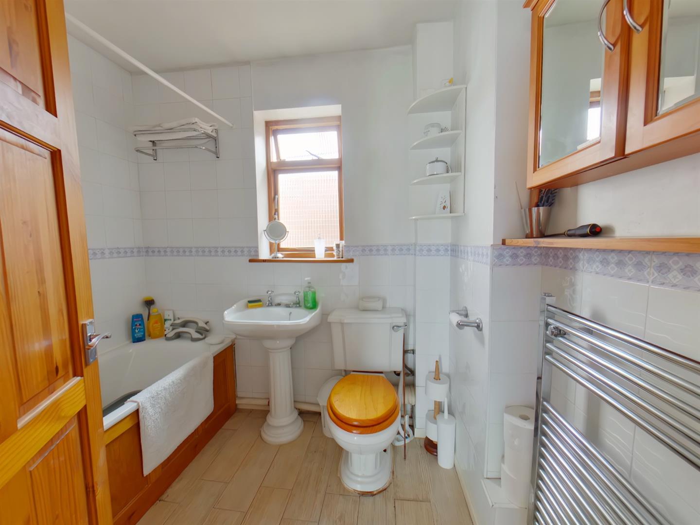 Bathroom - 2.45 x 1.75 (8'0" x 5'8") - Textured ceiling, window to side elevation, suite comprising panel bath with electric shower over, WC, wash hand basin, heated towel rail, partly tiled.