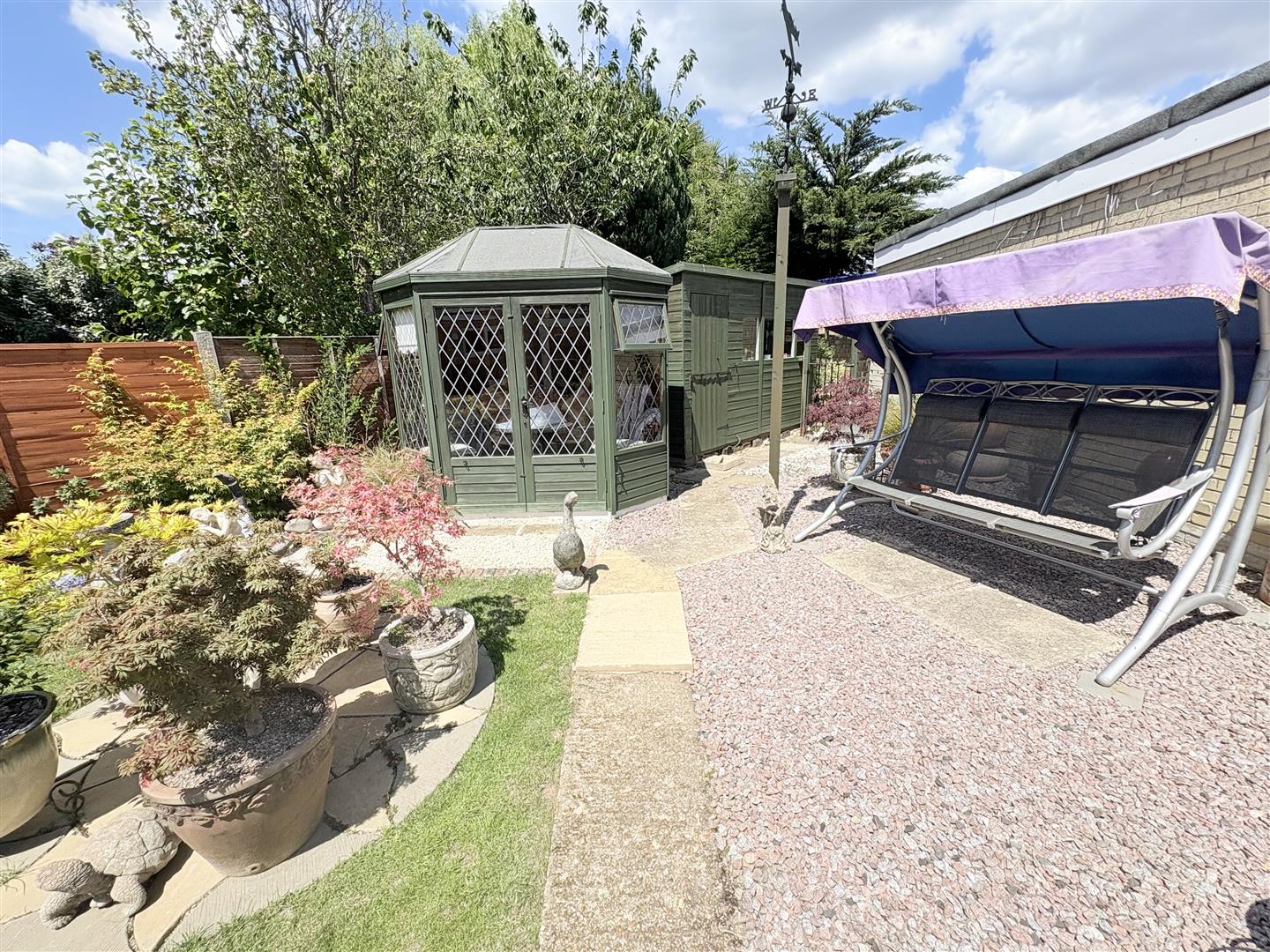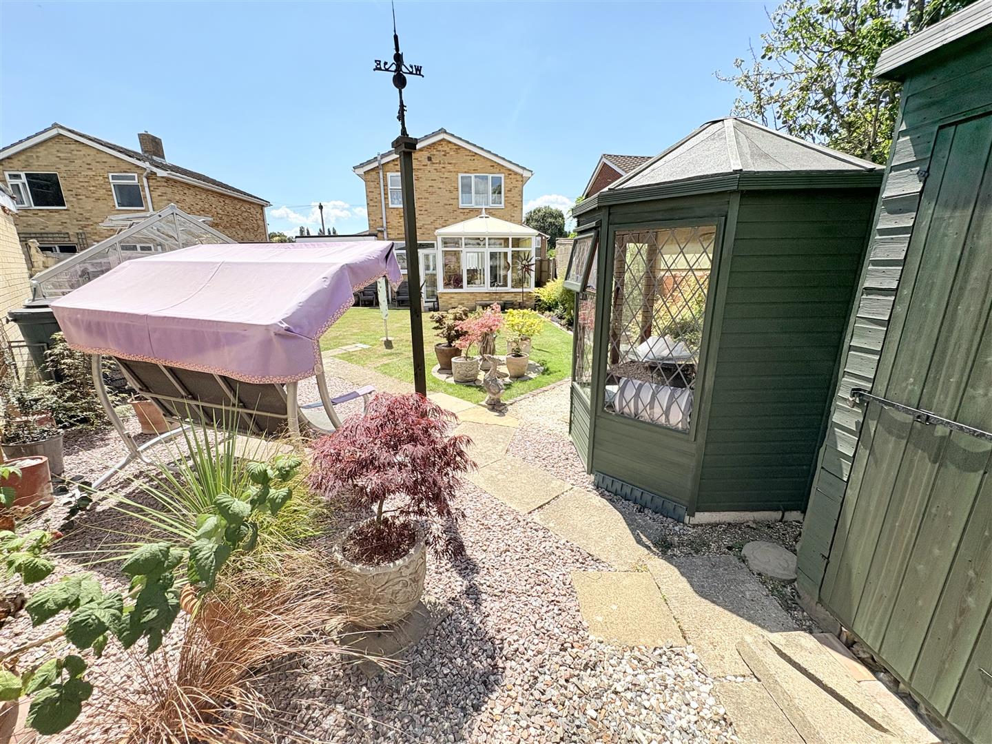Rear Garden - A fully enclosed landscaped rear garden with areas laid to lawn with borders, further area laid to patio, summer house and storage shed both with power, hardstand for large greenhouse, storage area to the rear of the shed.