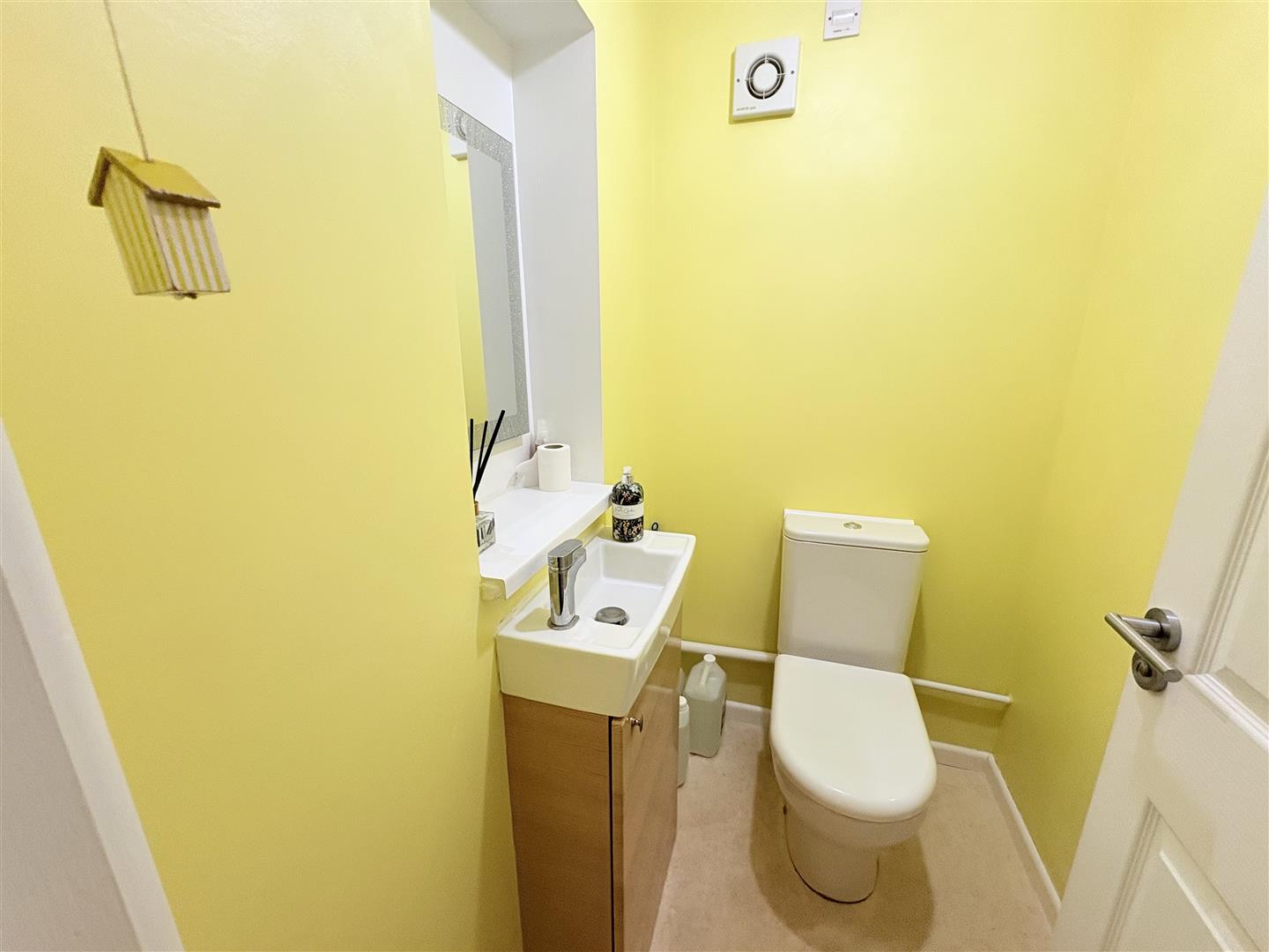 Downstairs Cloakroom - Skimmed ceiling, extractor fan, re-fitted suite comprising W.C, wash hand basin, heated towel rail.
