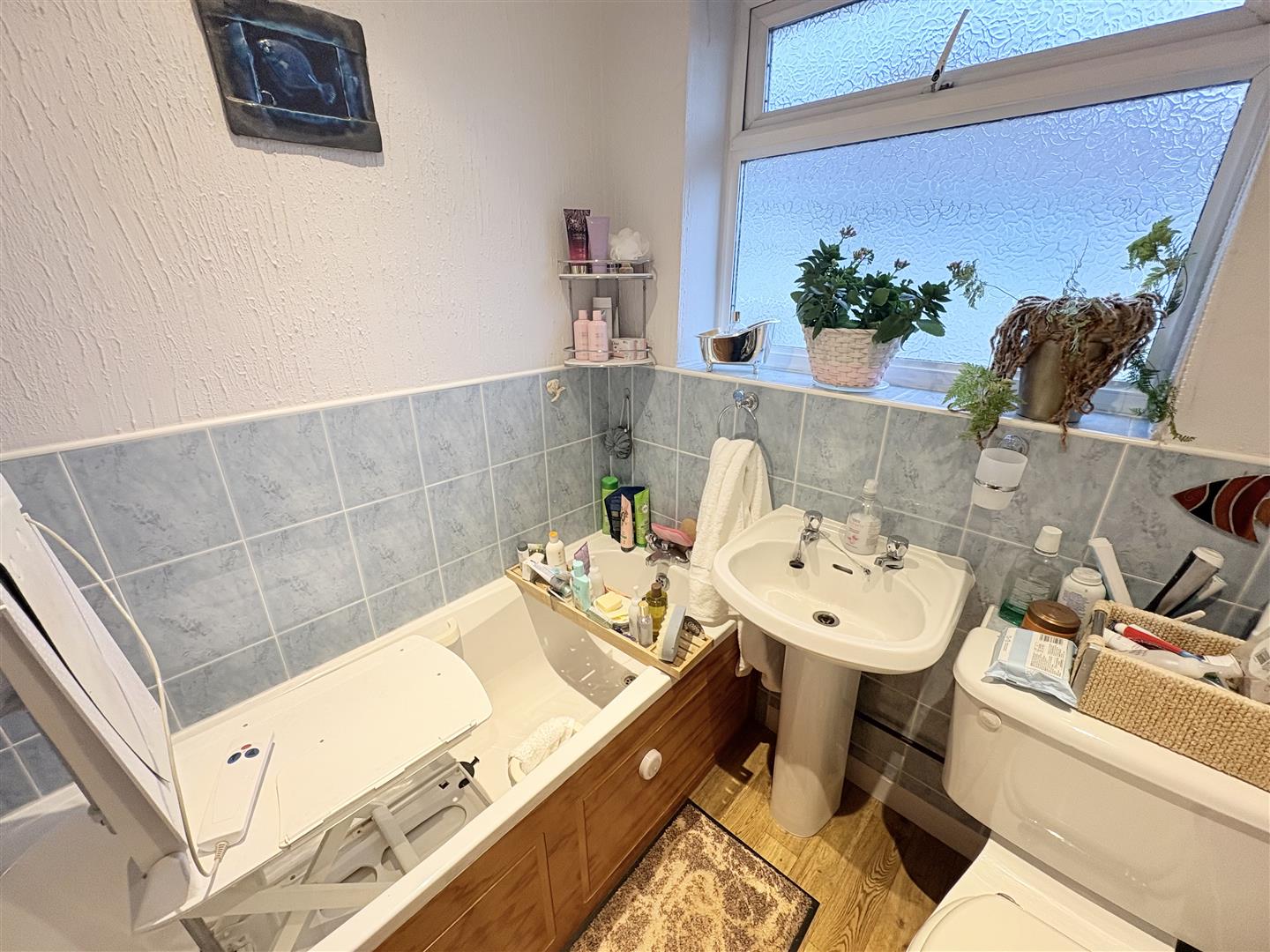Bathroom - Fitted with a panel bath with mixer taps, pedestal wash hand basin, low level WC, double glazed window to side elevations, radiator.