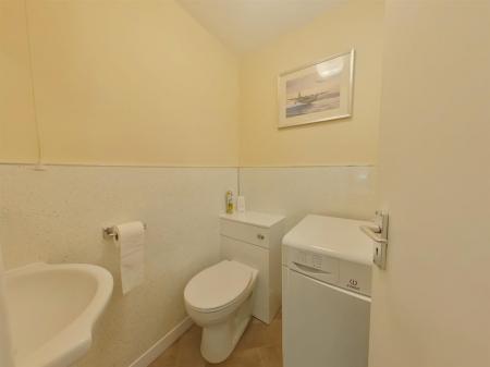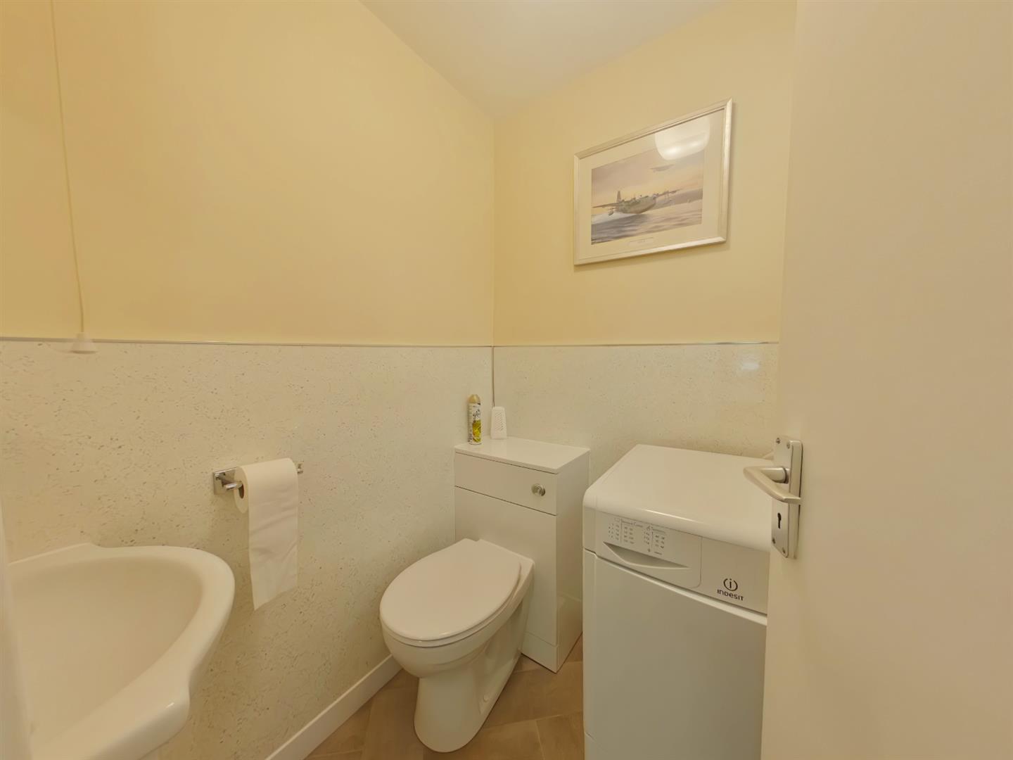 Cloakroom - Skimmed ceiling, suite comprising WC, vanity wash basin, window to side, heated towel rail, space for tumble dryer.