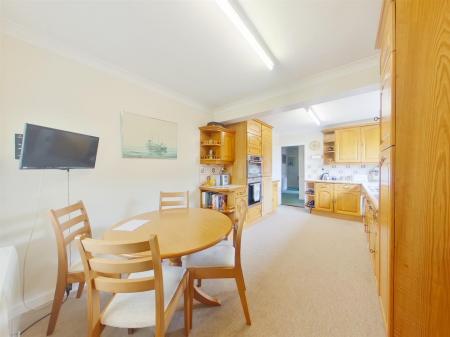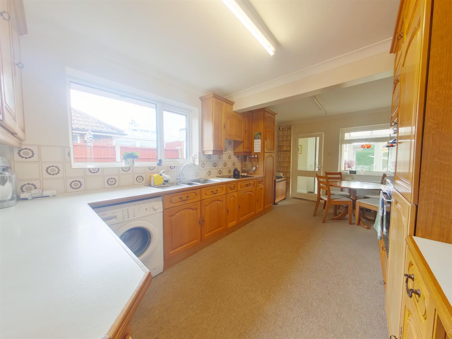 Kitchen/Breakfast Room - 18' 3'' x 9' 9'' (5.56m x 2.97m) - Skimmed ceiling, PVCu double glazed window to side elevation and rear, fitted range of wall and base/drawer units with work surface over, integrated fridge/freezer, plumbing for washing machine, eye level double oven, electric hob, space for table, door to: