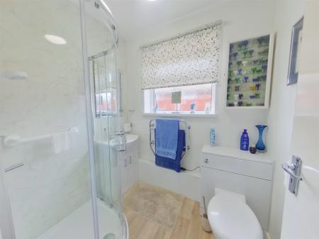 Shower Room - 6' 10'' x 5' 2'' (2.08m x 1.58m) - Textured ceiling, PVCu double glazed window to side elevation, suite comprising WC, vanity wash basin, heated towel rail, extractor fan.