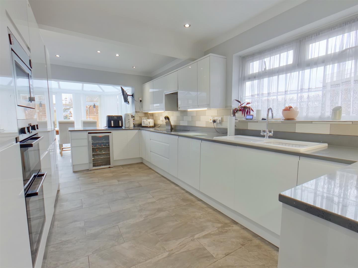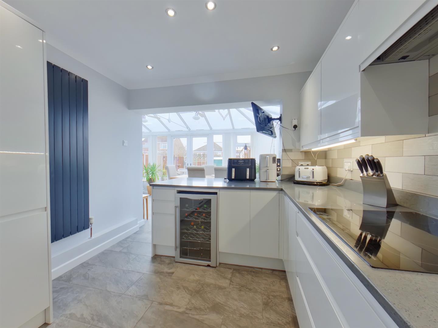 Kitchen - 5.20 x 3.16 (17'0" x 10'4") - Skimmed ceiling with spot lights, PVCu double glazed window to side elevations, re-fitted modern range of wall and base cupboard/drawer units with worksurface over, eye level microwave and electric oven, integrated fridge/freezer, dishwasher, washing machine, space for wine cooler, vertical radiator, induction hob with hod over. Open to: