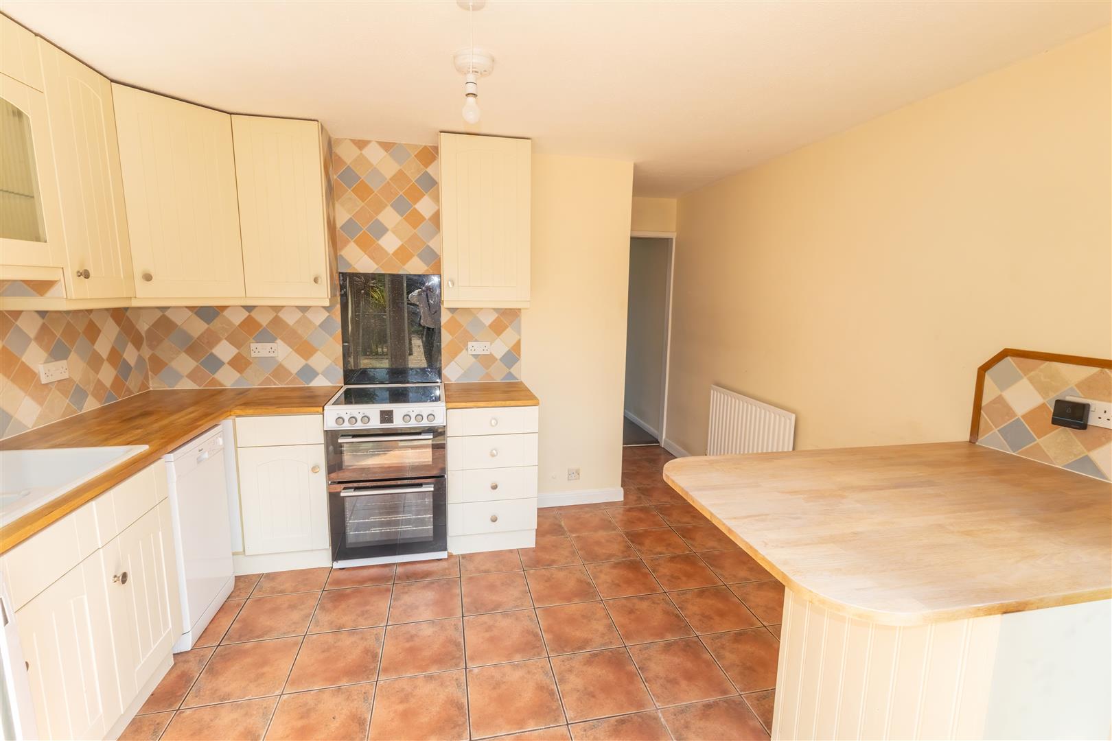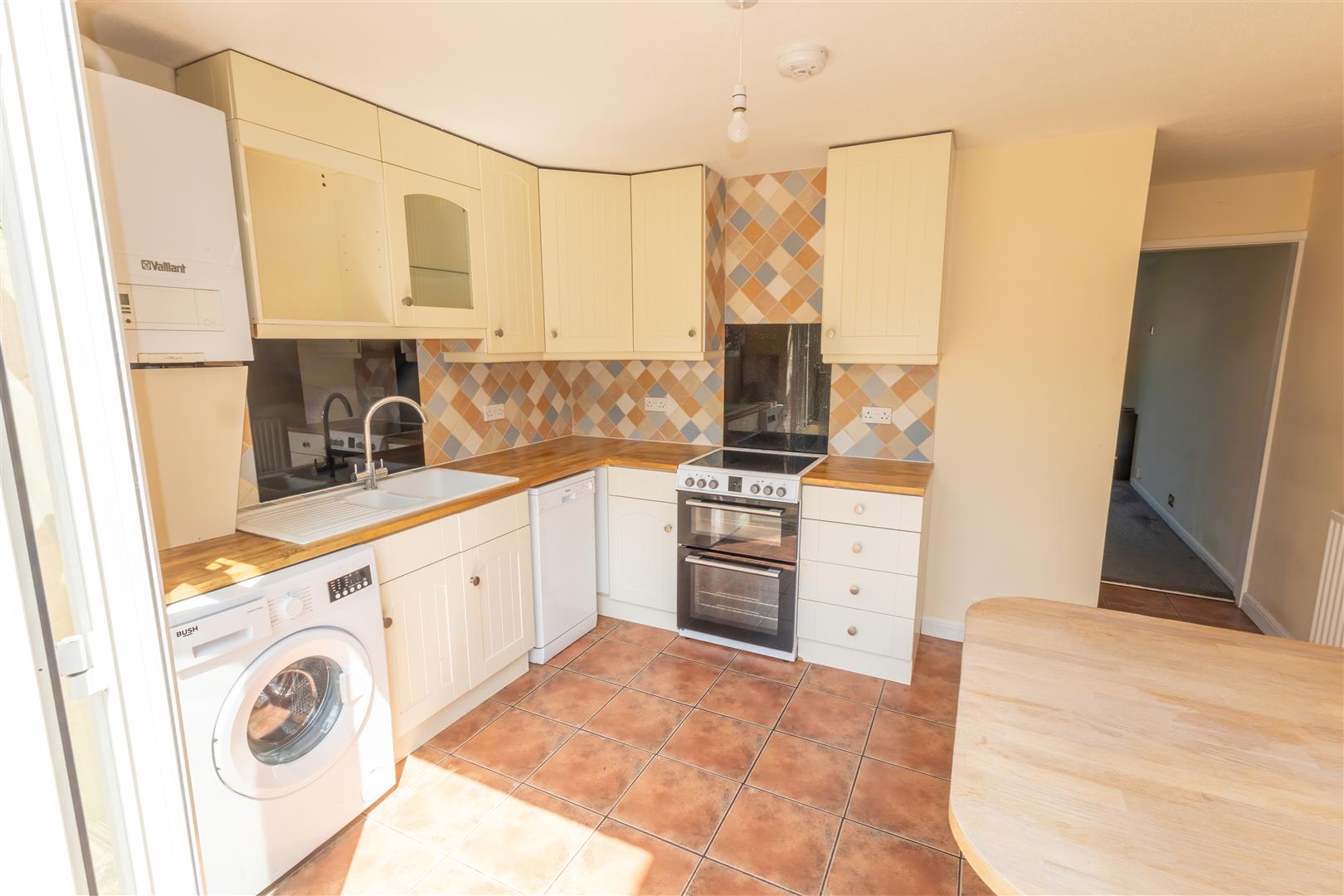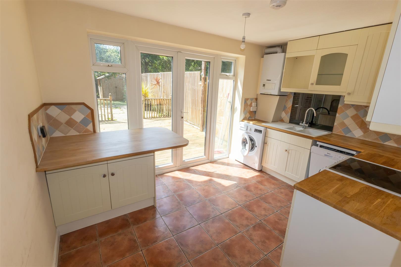 Kitchen/Breakfast Room - 3.71m x 2.57m (12'2" x 8'5") - Textured ceiling, French style doors to rear garden, fitted range of modern wall and base units with work surface over, inset 1 1/2 bowl sink with mixer taps, space for washing machine and dish washer, space for slot in cooker, breakfast bar with seating area, wall mounted boiler.