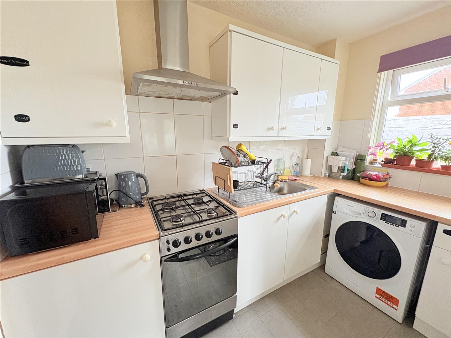 Kitchen - 9' 2'' x 5' 6'' (2.79m x 1.68m) - Textured ceiling, PVCu double glazed window to side elevation, fitted wall and base units with work surface over, inset sink, plumbing for washing machine, and cooker, storage cupboard housing fridge/freezer .