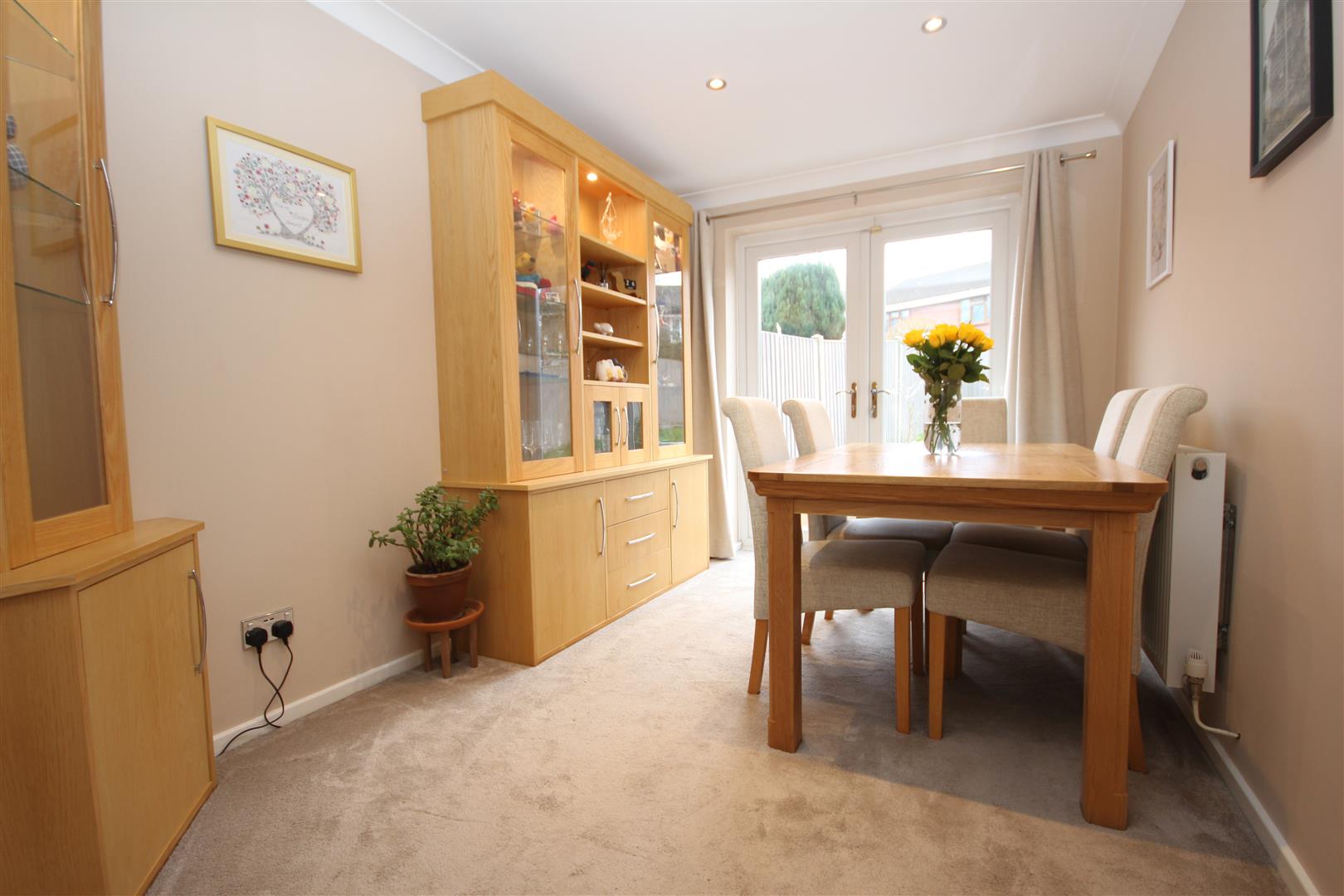 Dining room with double doors opening out onto the rear garden & fitted storage units & glass display cabinets