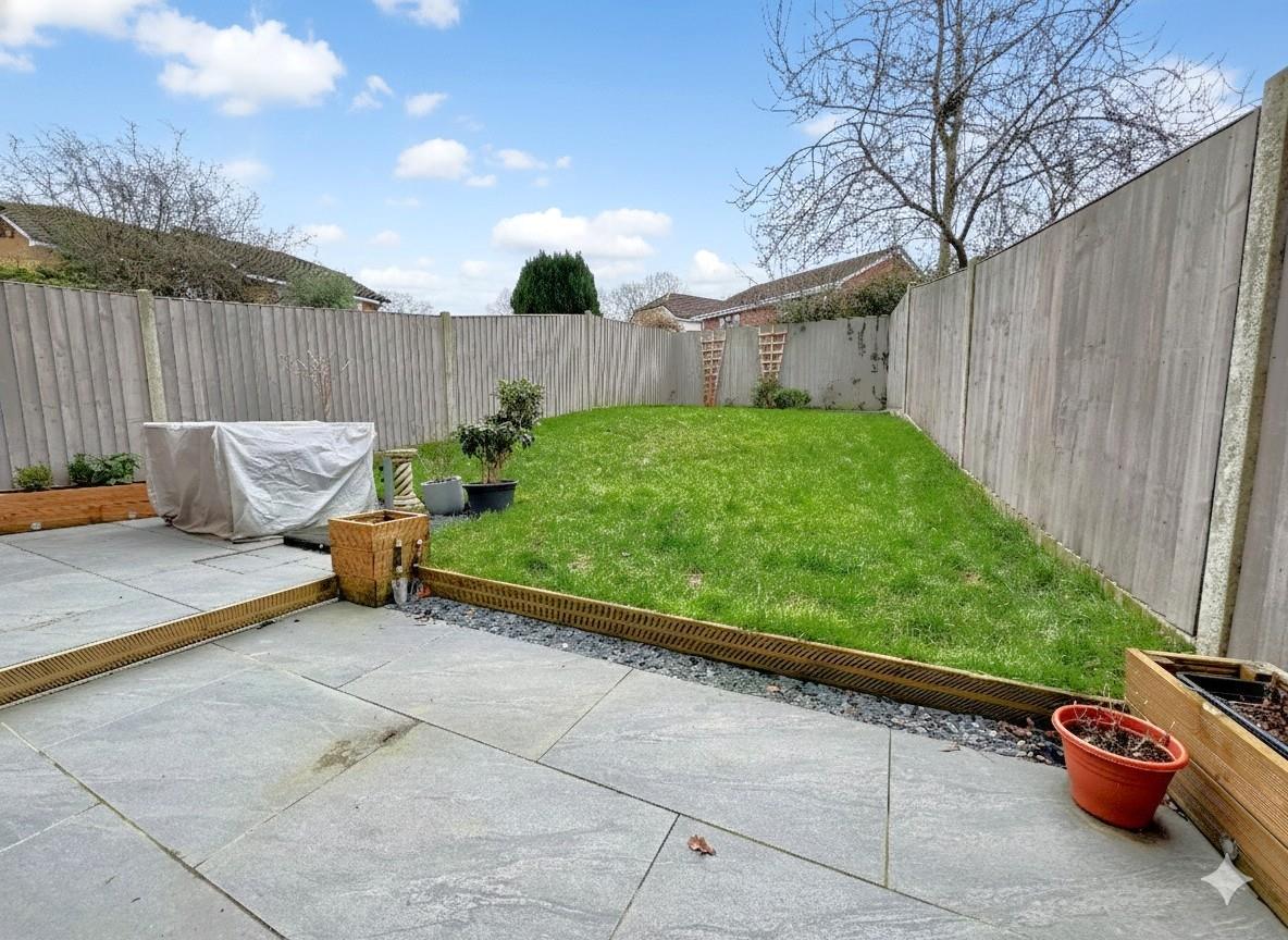 Landscaped southerly facing rear garden majority laid to lawn with paved patio & raised sleepers with display flower/shrubbery