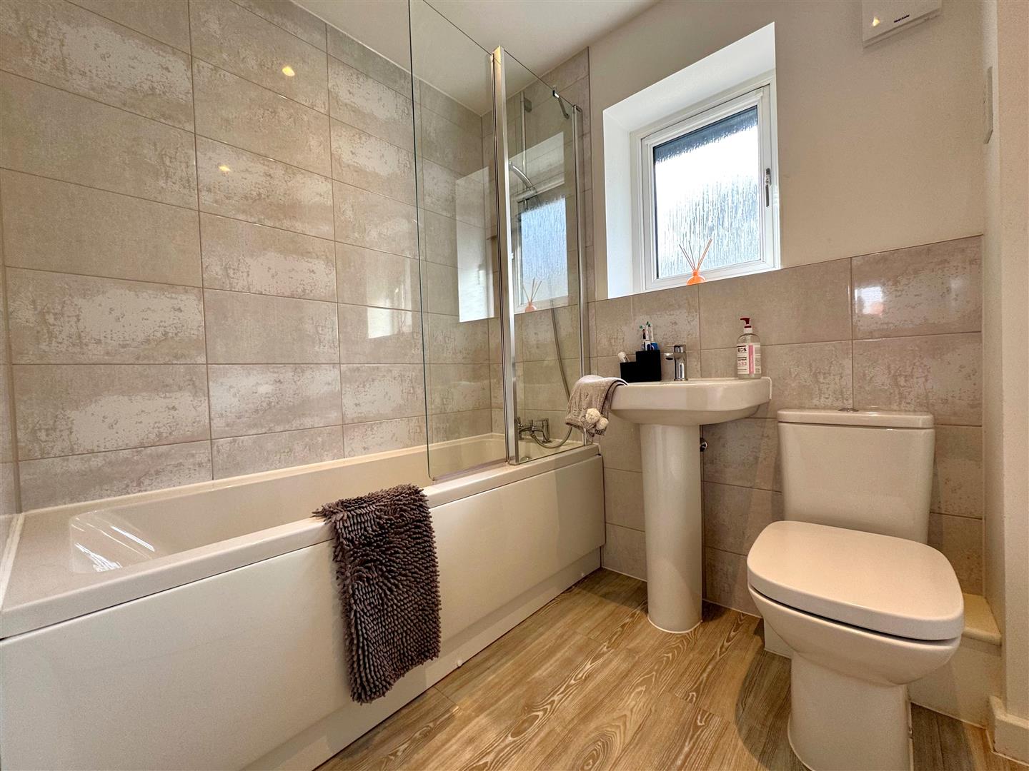 Modern main bathroom comprising three piece white suite & attractive wall tiling