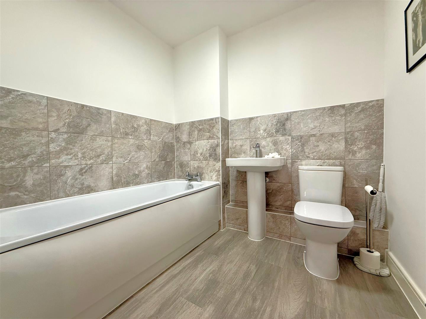 Modern main bathroom comprising three piece white suite & attractive wall tiling