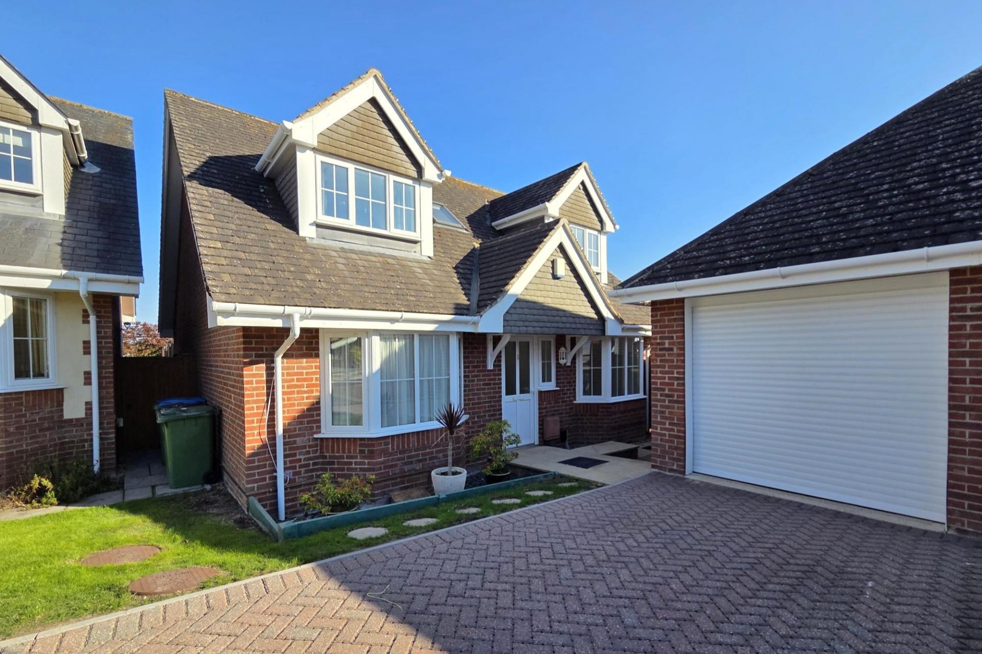To the front of the property, there is block paved parking in front of the GARAGE (left hand side as you look at the pair of garages), path leading to the front door and side gated pedestrian access.