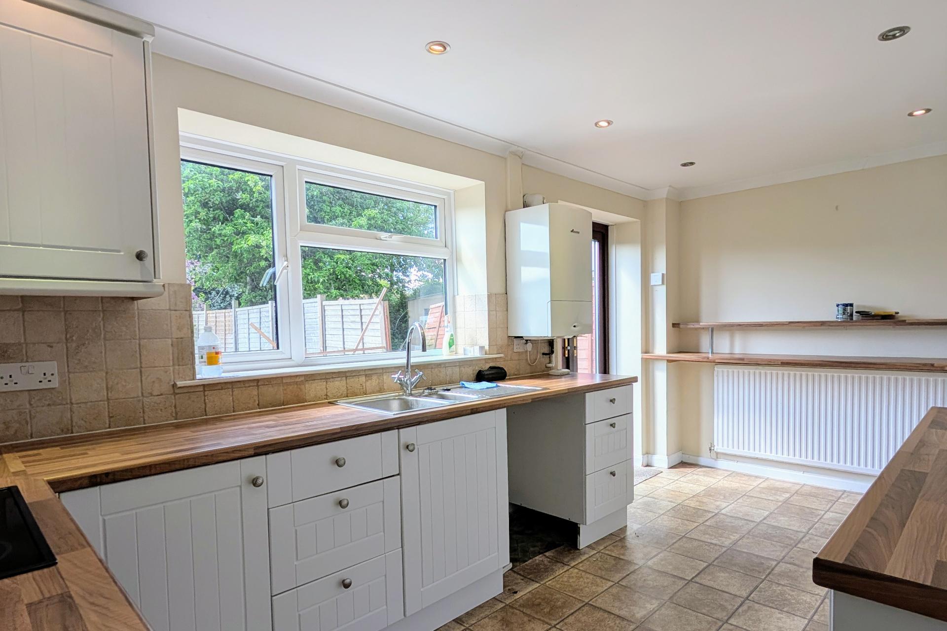 Obscure door leading to the porch. Double glazed French doors leading to the rear garden and double glazed window overlooking the rear garden. Smooth and coved ceiling with inset spotlighting. Matching wall and base units with contrasting worktops. Inset stainless steel sink and half drainer. Fitted oven/grill. Four ring electric hob. Space for fridge/freezer, washing machine and tumble dryer. Wall mounted 'Worcester' boiler. Radiator. Tile effect vinyl flooring.
