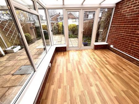 Conservatory - 9' 8'' x 9' 0'' (2.94m x 2.75m) - Constructed of glazed elevations upon a dwarf brick wall with a polycarbonate sloping roof, power points, wood laminate flooring, French doors to rear garden.