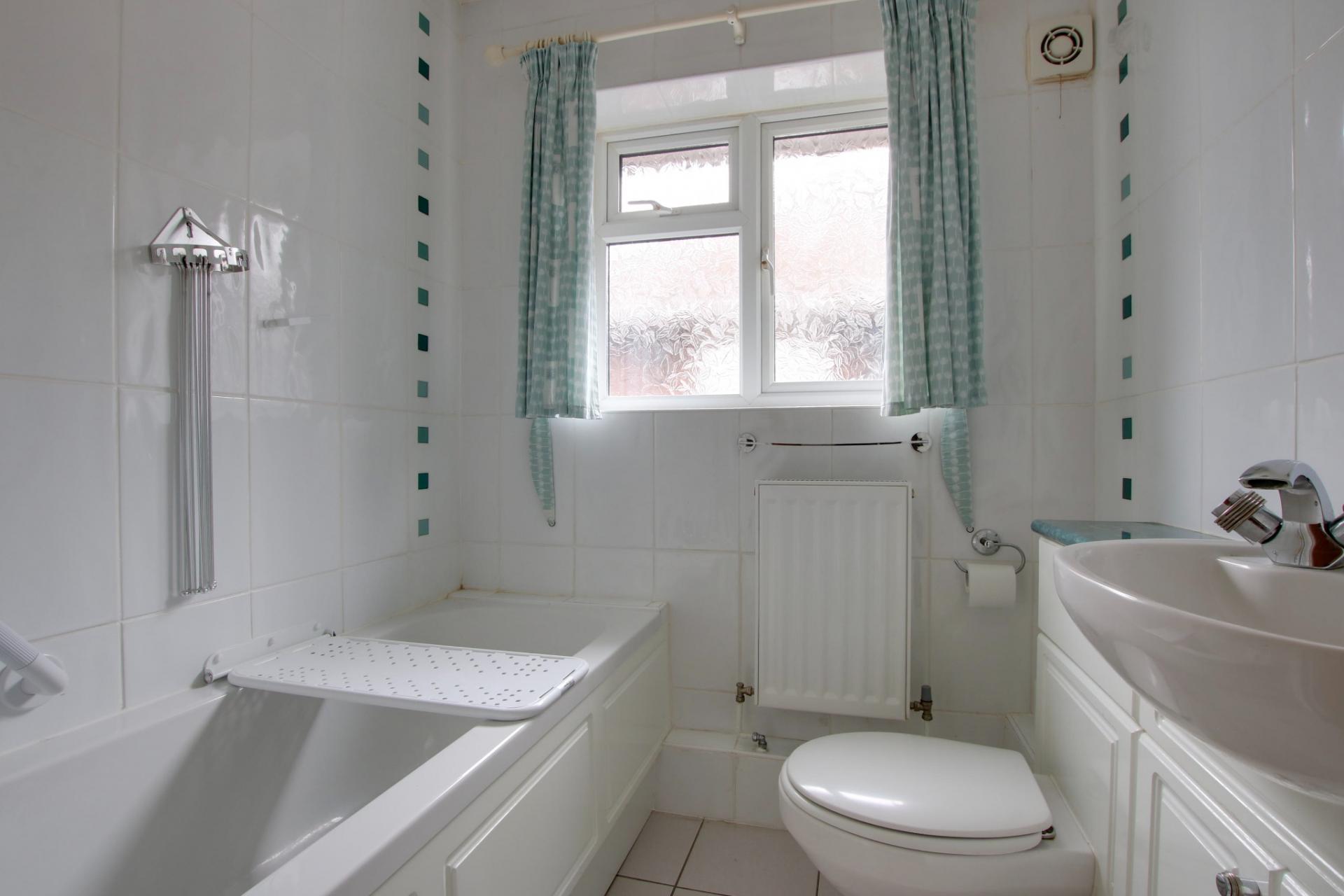 Double glazed window to side elevation. Panel enclosed bath with shower unit and shower attachment over. Vanity unit with wash hand basin and storage beneath. Low level close coupled WC. Tiled flooring and walls. Radiator. Extractor fan,