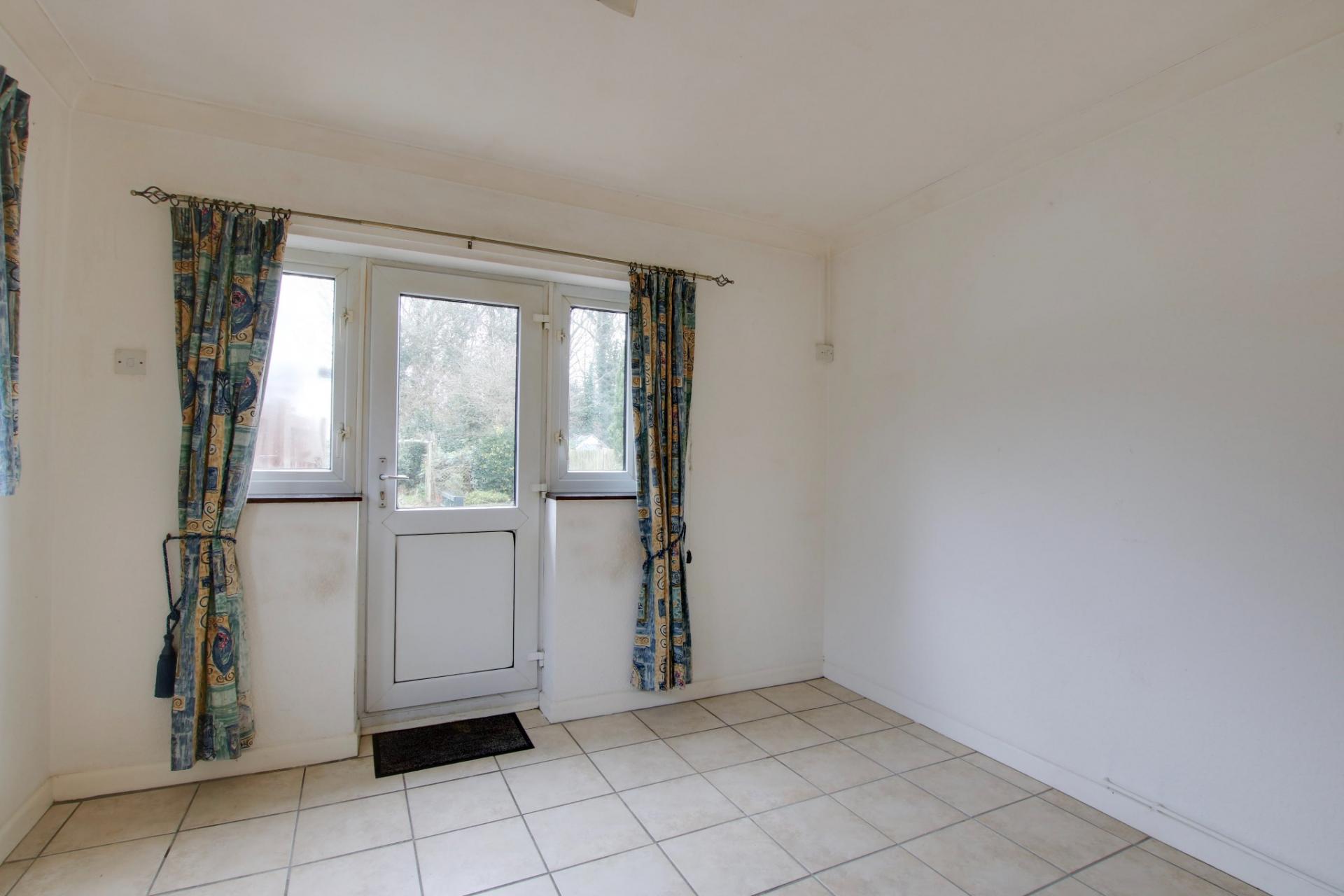 Two double glazed windows to side elevation and double glazed door to garden. Kitchen comprising one and a half bowl single drainer sink unit with cupboard under. Further range of wall and base level units with roll edge work surfaces over and splash back tiling. Built-in and concealed fridge/freezer. Plumbing for washing machine. Space for cooker. Area for dining table.