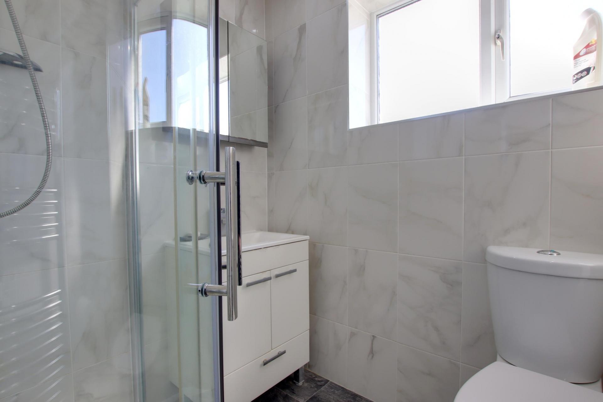Double glazed obscure window to the side aspect. Smooth ceiling with inset spotlighting. Modern suite comprising; shower cubicle, wash hand basin with storage beneath. Low level WC. Heated towel rail. Tiled walls. Tiled effect vinyl flooring.