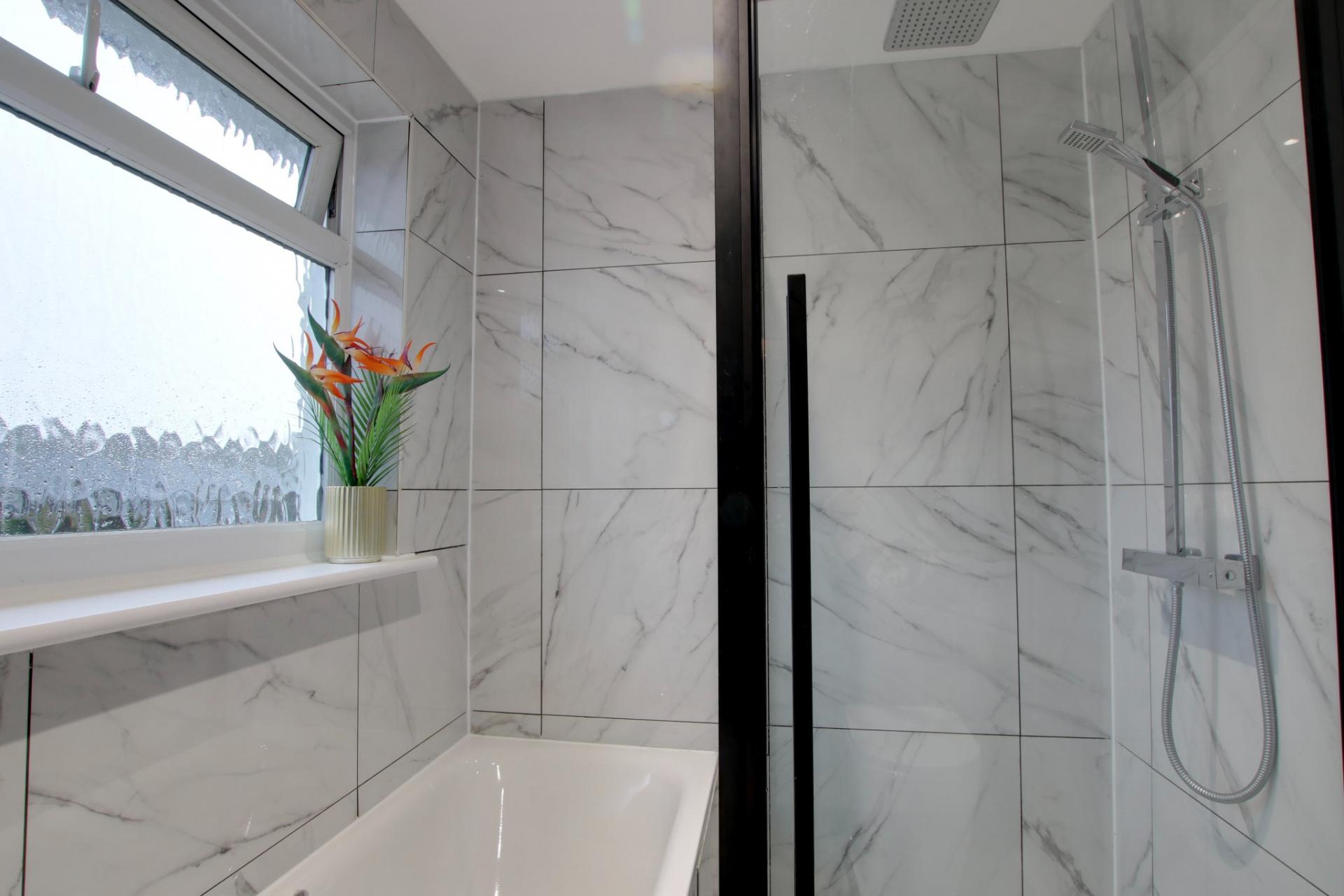 Double glazed window to rear elevation. Recently-re-fitted four piece bathroom with panel enclosed bath with mixer taps and hand shower. Separate shower cubicle with wall mounted shower unit and monsoon shower head. Vanity unit with wash hand basin and storage beneath. Low level close coupled WC. Heated towel rail. Tiled walls and floor. Insert ceiling spotlights. Extractor fan.