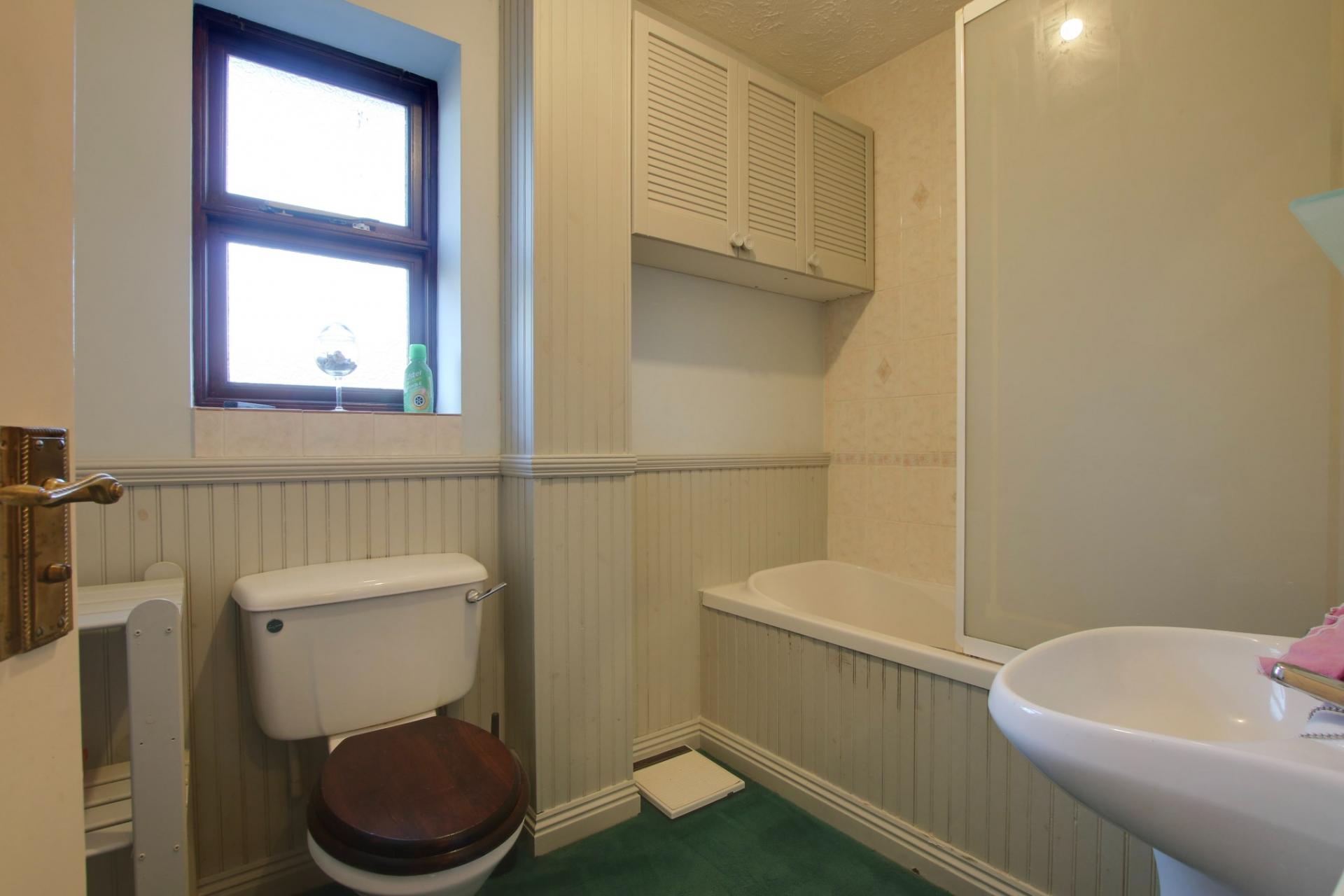 Double glazed window to side elevation. Low level close coupled WC. Panel enclosed bath. Pedestal wash hand basin. Radiator. Electric shaver point. Extractor fan.