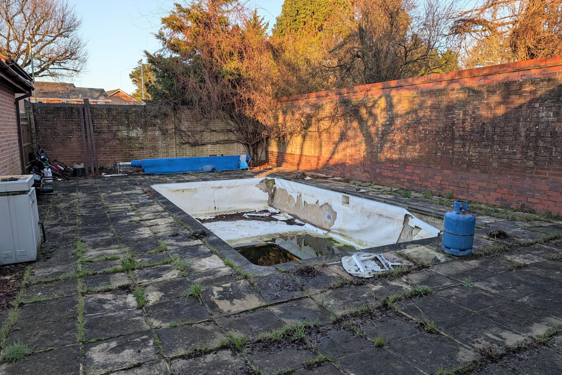 The 'L' shaped rear garden runs behind the property and extends along the side of the double garage. There are lawned area and flower and shrub borders and a garden pond. To the side of the property is a swimming pool which does require a general overhaul including a new liner. The garden is wall and fence enclosed and has gated side pedestrian access.