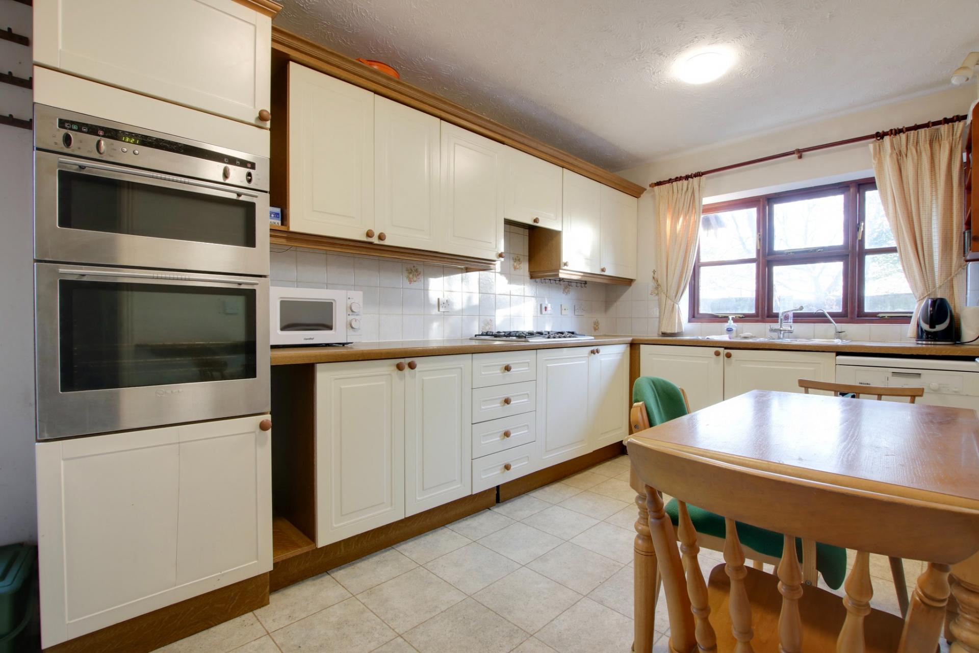 Double glazed window to rear elevation. Kitchen comprising one and a half bowl stainless steel single drainer sink unit with cupboard under. Further range of wall and base level units with roll edge work surfaces over and splash back tiling. Built-in five ring gas hob with cooker hood over. Plumbing for dishwasher. Built-in eye-level oven and grill with cupboards under and over. Space for breakfast table area. Utility area with stainless steel single drainer sink unit set into work surfaces with cupboard under. Plumbing for washing machine and space for tumble dryer. Wall mounted gas boiler. Space for fridge/freezer. Double glazed door to side driveway.