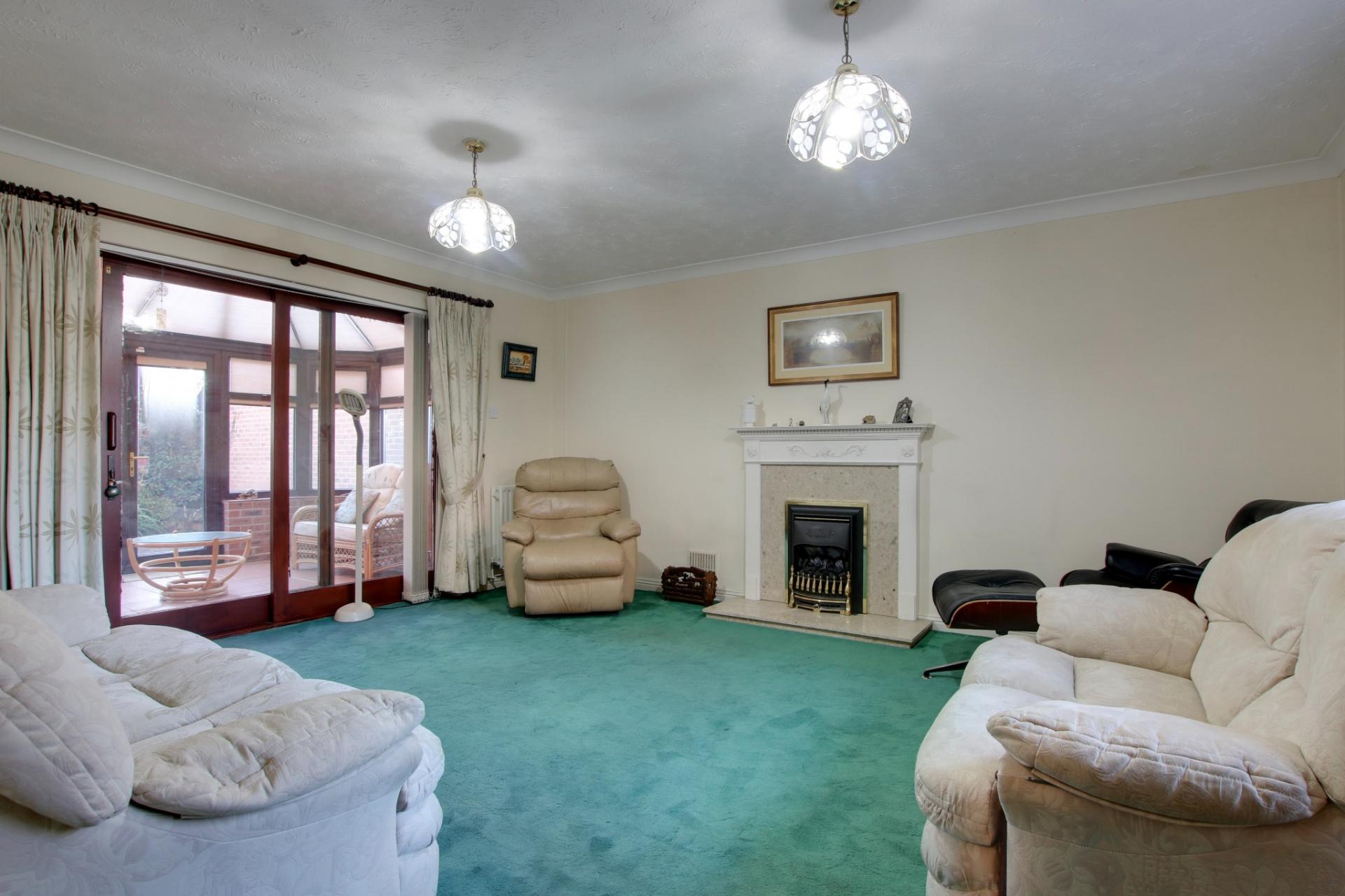 Double glazed window to front elevation and double glazed patio doors to conservatory. Feature fireplace with inset coal effect gas fire. Coved and textured ceiling. Radiator.