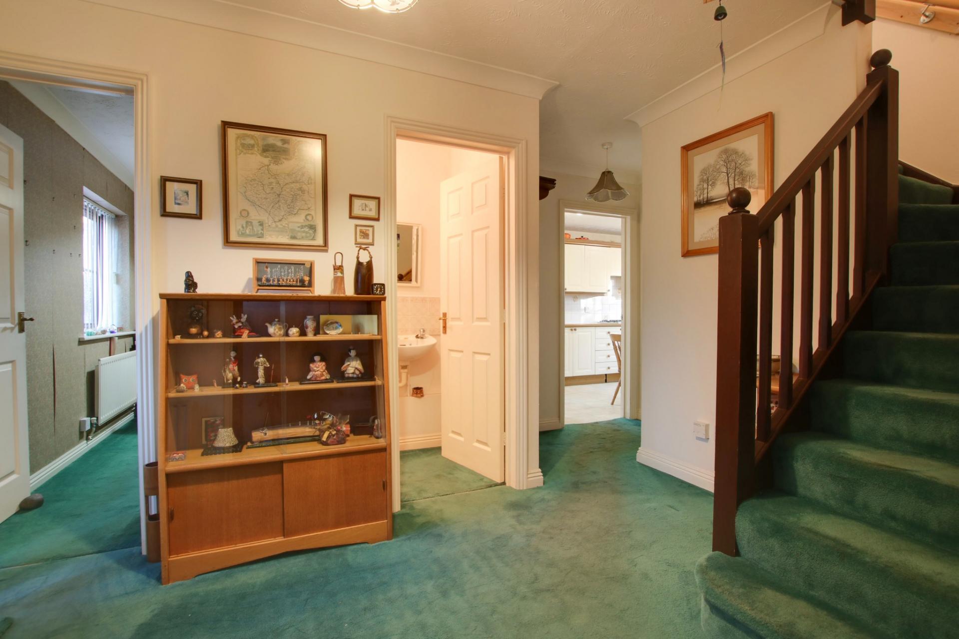 Stairs to first floor. Radiator. Understairs storage cupboard. Double doors to lounge and doors to: