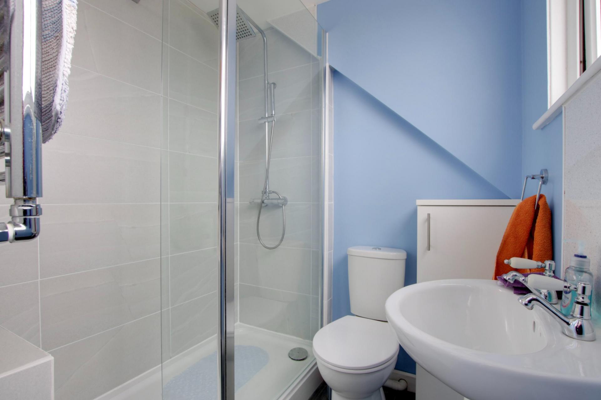 Double glazed window to front elevation. Low level close coupled WC. Pedestal wash hand basin. Walk-in shower cubicle with monsoon shower head.