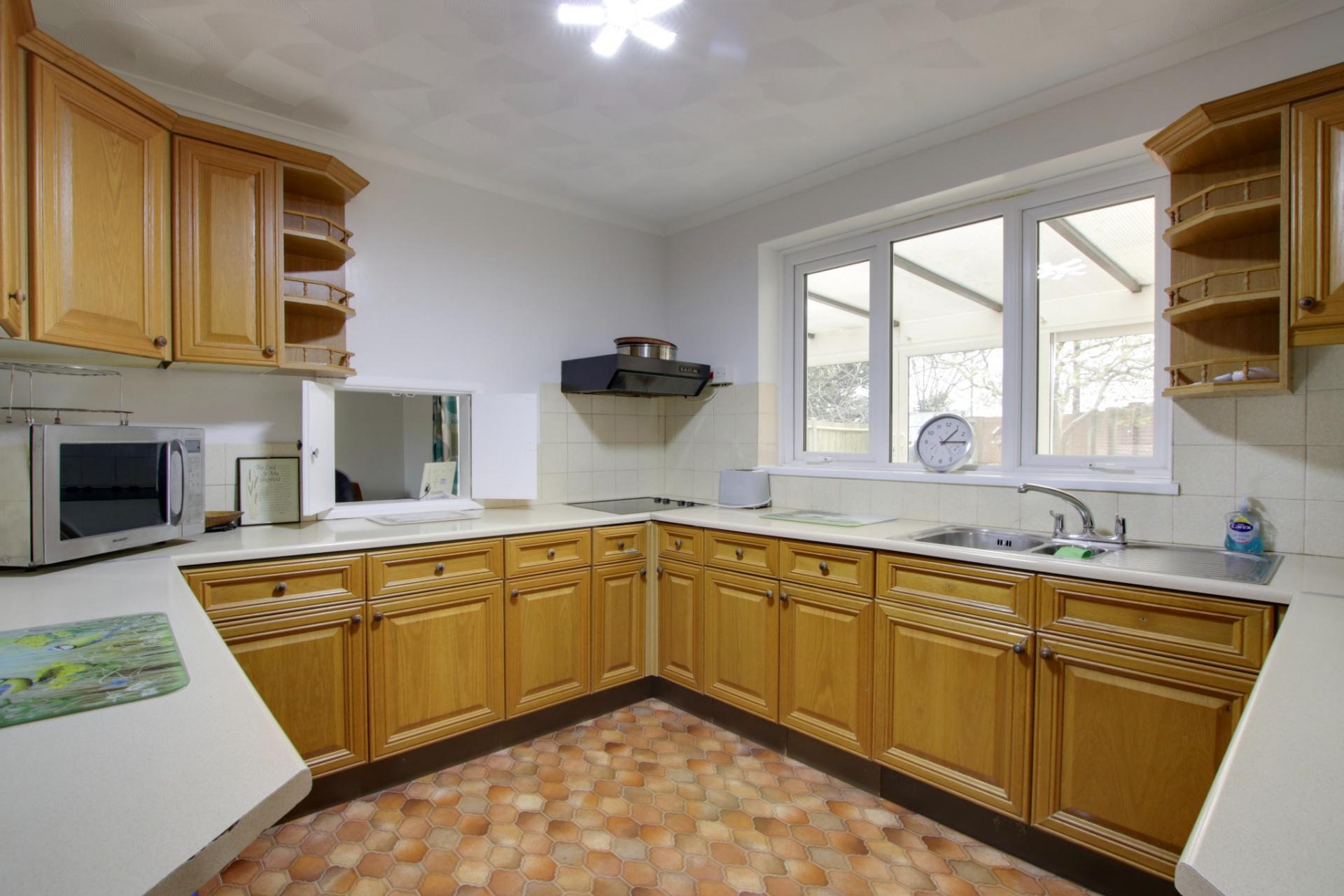 Double glazed window to conservatory. One and a half bowl stainless steel single drainer sink unit with cupboard under. Further range of wall and base level units with roll edge work surfaces over and splash back tiling. Built-in four ring ceramic hob with cooker hood over. Breakfast bar. Radiator. Doorway to: