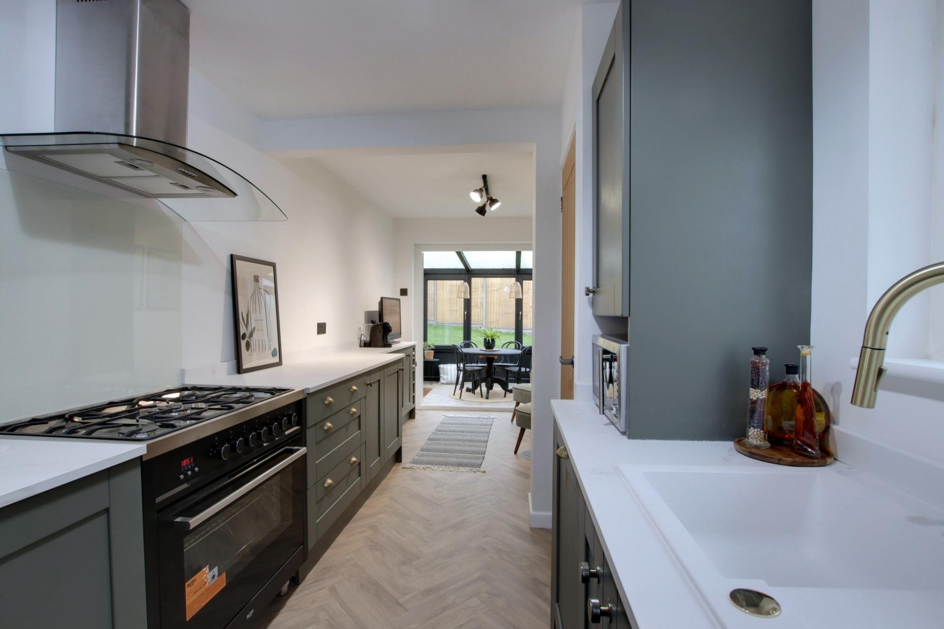 This attractive and comprehensively fitted kitchen has ample base cupboards with matching drawers, marble effect worktops and fitted wine rack. Appliances include an integrated fridge/freezer and dishwasher, newly installed freestanding dual fuel range style cooker with glass splash back and circulating stainless steel and glass canopy style cooker hood. Space and plumbing for washing machine. Matching wall cupboard housing a gas boiler for central heating and hot water with space beneath for microwave. Built-in larder with window also housing the gas meter. Herringbone wood effect flooring. Vertical radiator. Double glazed window to side elevation and double glazed French doors to: