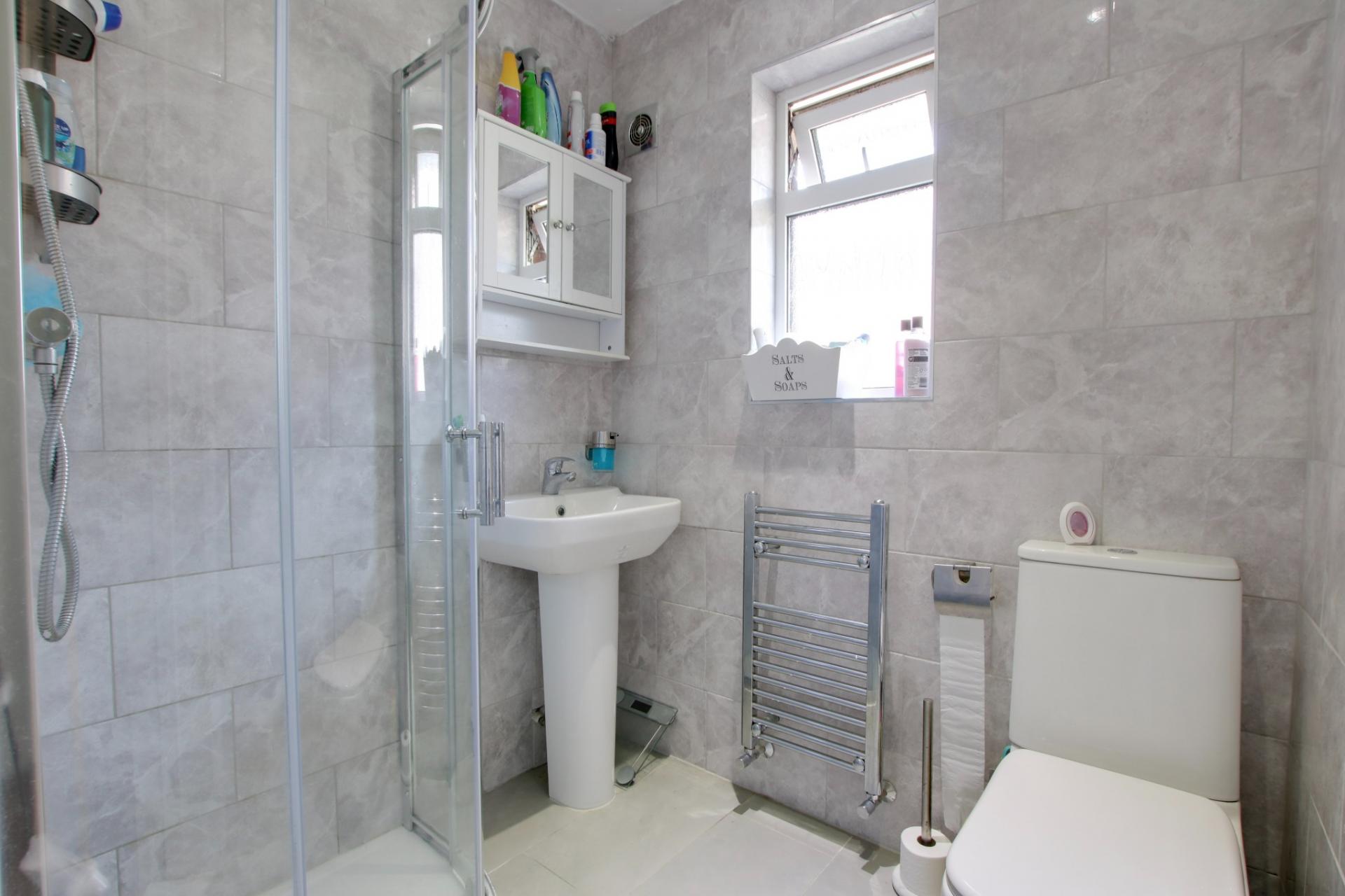 Double glazed window to side elevation. Quadrant shower cubicle. Pedestal wash hand basin. Low level close coupled WC. Heated chrome towel rail. Tiled walls and floor. Extractor fan. Inset ceiling spotlights.
