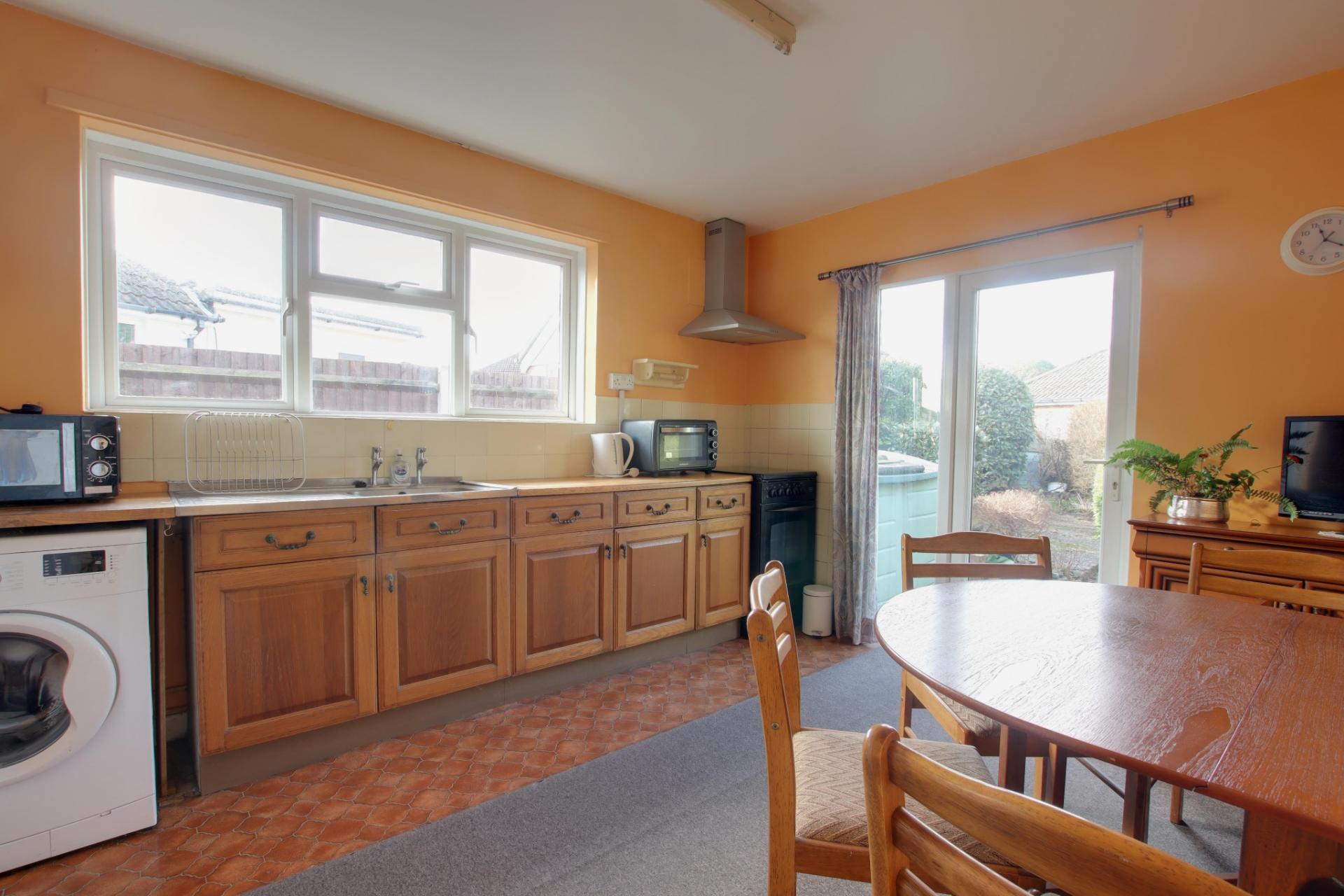Dual aspect double glazed door leading to the rear garden. Tall double glazed window to the rear aspect and additional double glazed window to the side aspect. Smooth ceiling. Wall and base units with contrasting work tops. Inset stainless steel sink and drainer. Space for cooker, washing machine and fridge/freezer. Radiator. Vinyl flooring.