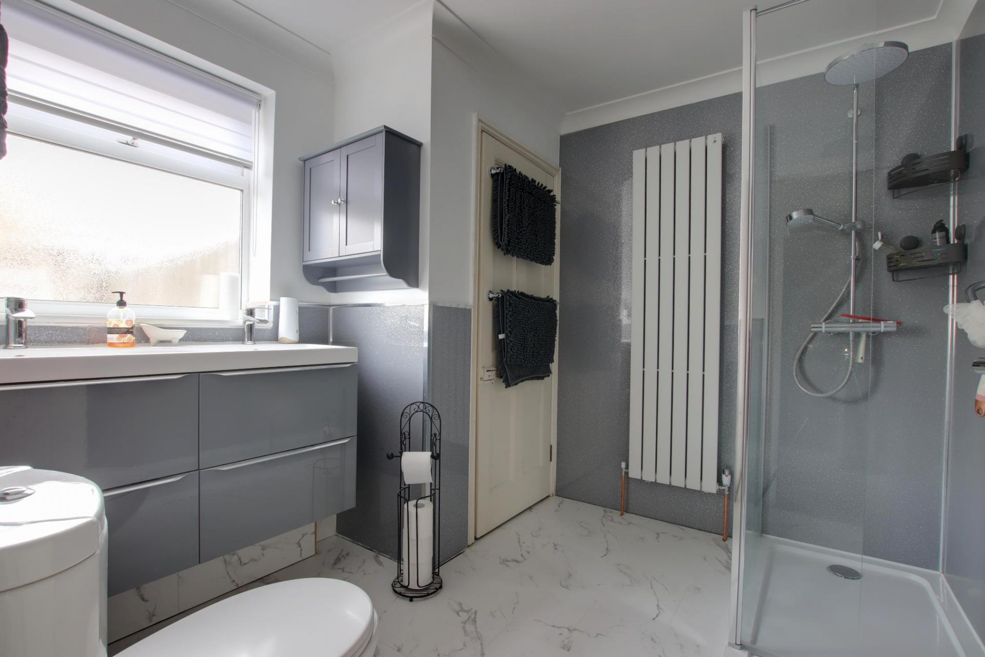 Double glazed window to the side aspect. Smooth and coved ceiling. Modern re-fitted suite comprising; large walk-in shower area with screen. Twin wash hand basins with storage beneath. Low level WC. Part aqua board walls. Radiator (to be fitted by the vendor). Marble effect luxury vinyl tiled flooring. Storage cupboard with wall mounted 'Vaillant' boiler.