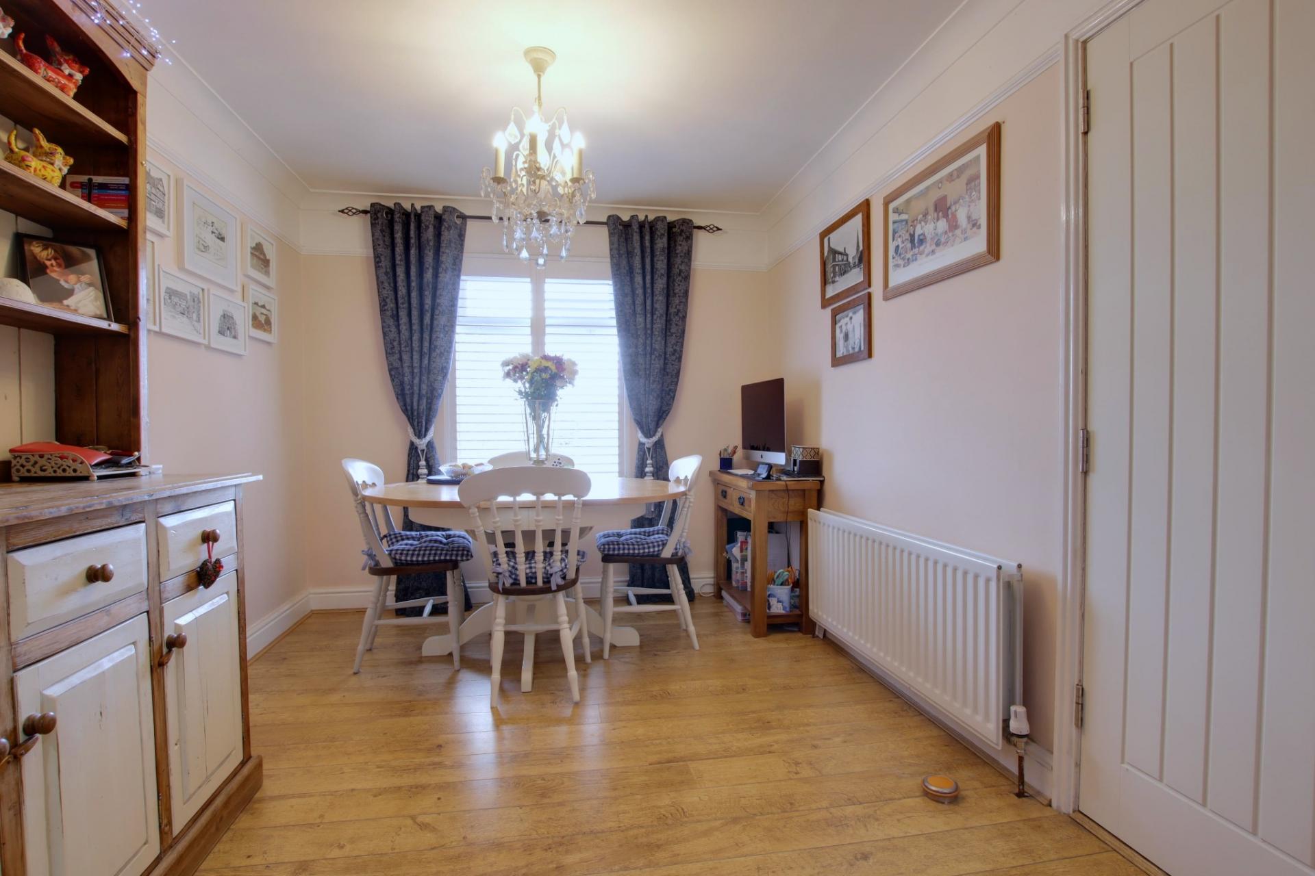 Double glazed window to the front aspect with fitted plantation shutters. Smooth and coved ceiling with feature beams. Feature brick fireplace with tiled hearth and wooden mantle piece. Multi-fuel stove available via negotiations. Radiator. Wood effect laminate flooring.