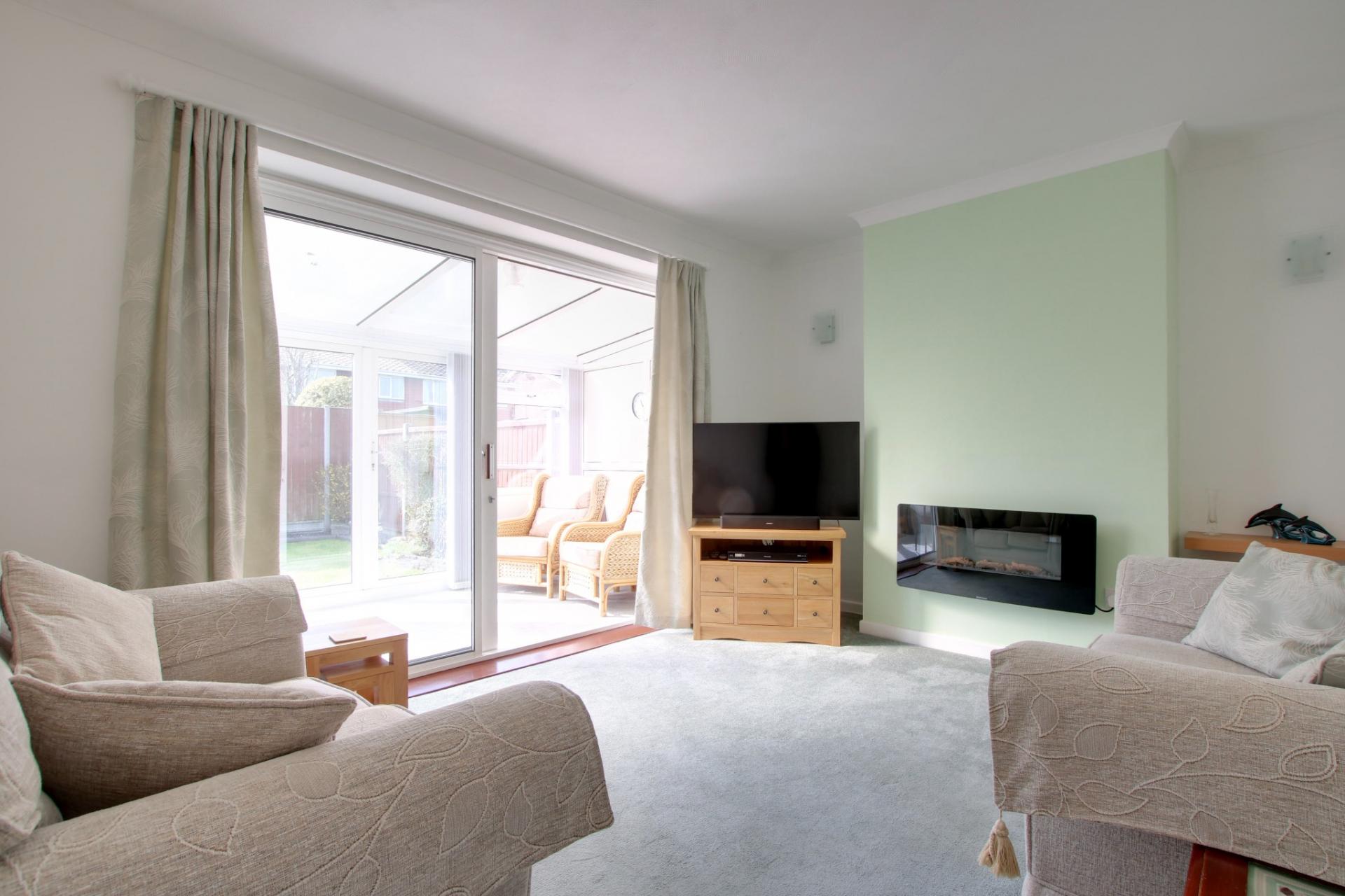 Double glazed patio doors to conservatory. Chimney breast with modern electric fire. Radiator. Coved and textured ceiling.