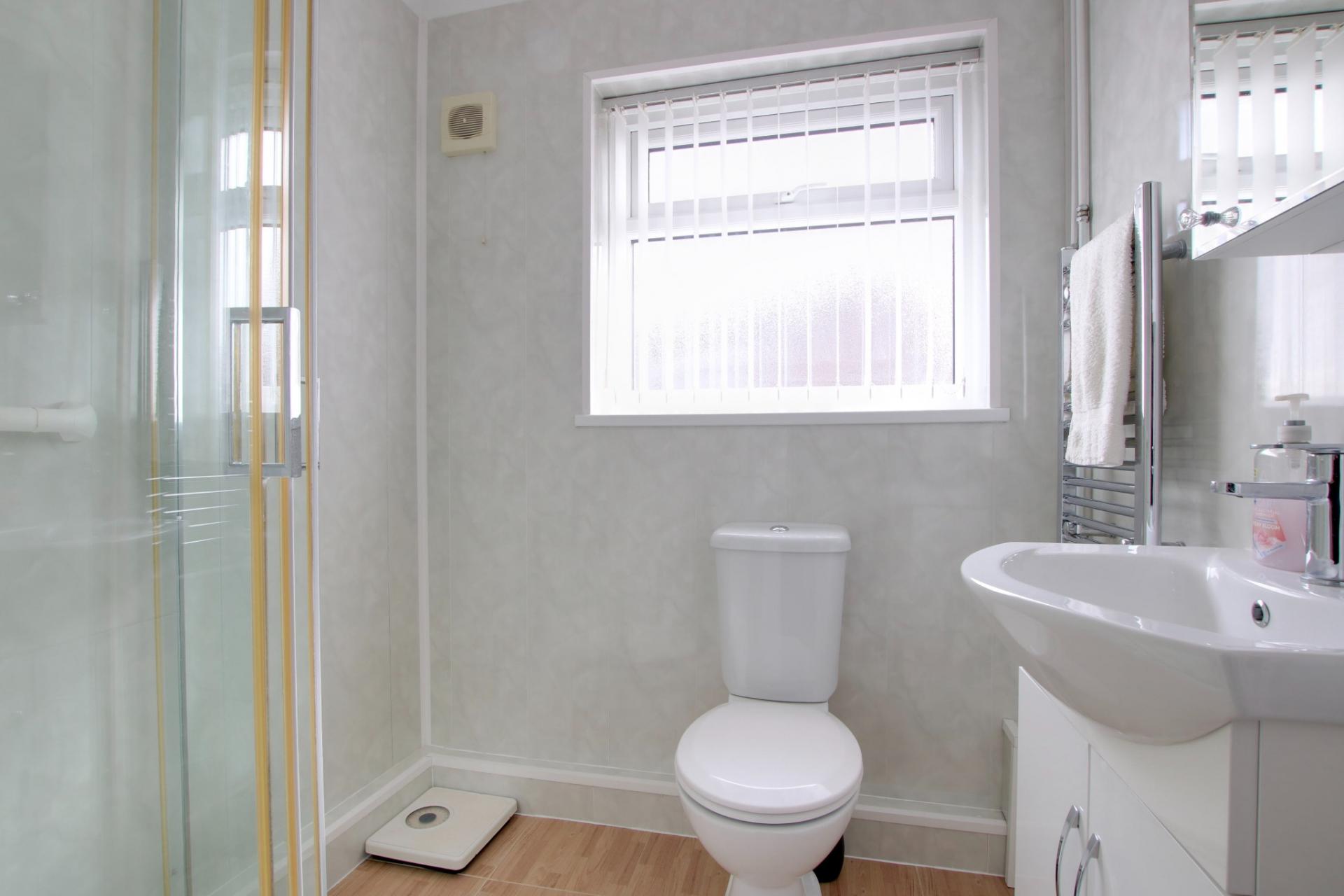 Double glazed window to side elevation. Quadrant shower cubicle with electric shower unit. Low level close coupled WC. Vanity unit with wash hand basin and storage beneath. Heated chrome towel rail.
