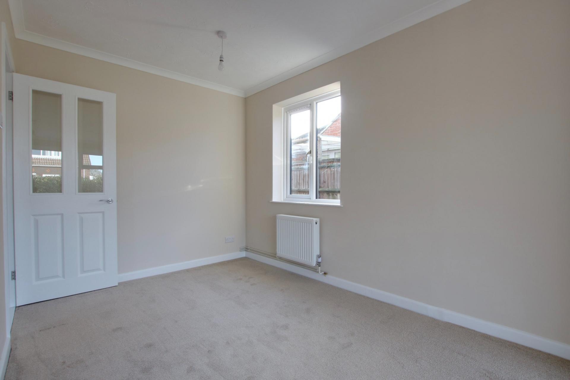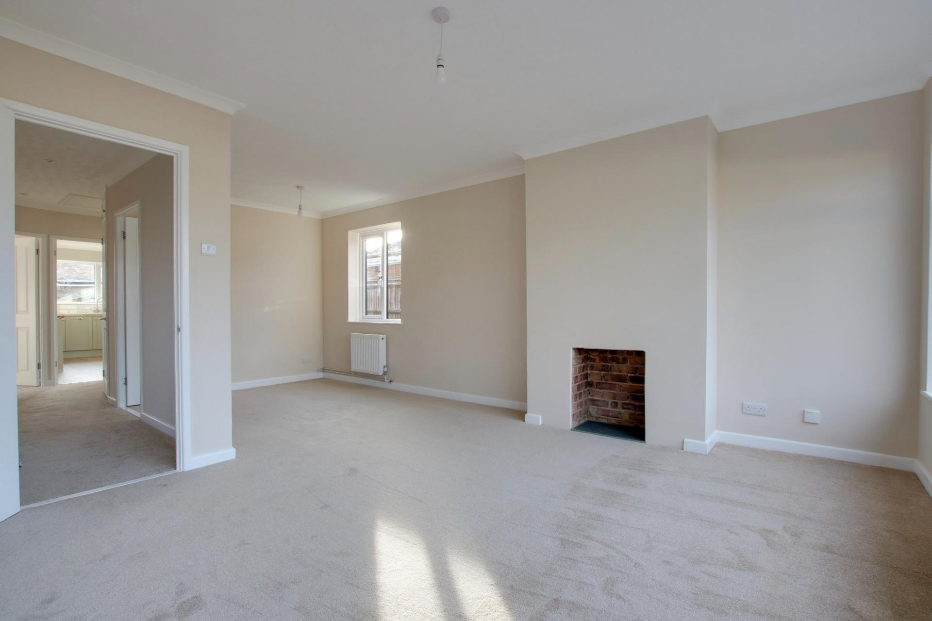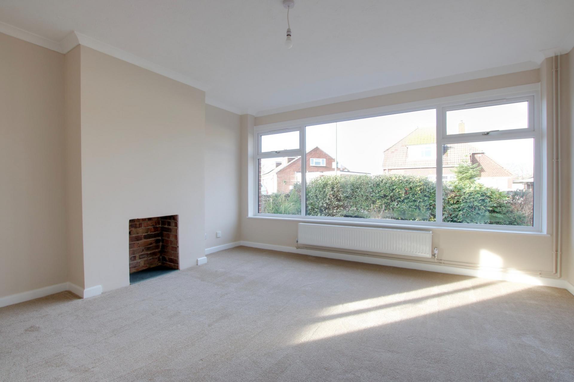 Dual aspect 'L' shaped room with double glazed windows to front and side elevation. Chimney breast with fireplace. Two radiators. Coved and textured ceiling.