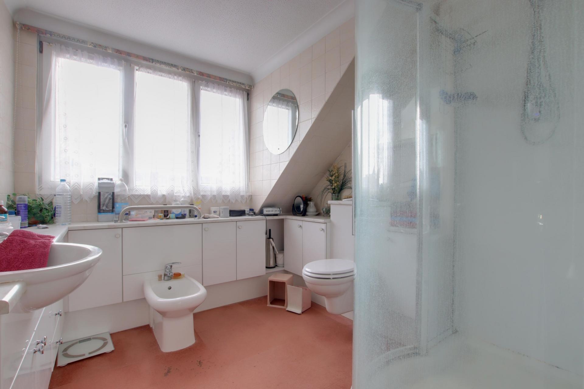 Double glazed window to front elevation. Four piece shower with shower enclosure and wall mounted shower unit. Low level close coupled WC. Bidet. Wash hand basin with storage beneath and further bathroom storage units. Overstairs storage cupboard. Heated chrome towel rail. Tiled walls. Coved and textured ceiling.