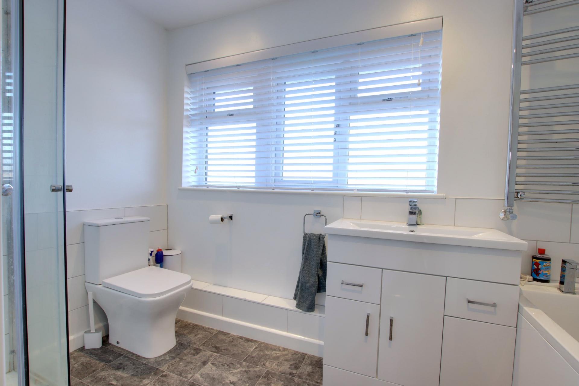 Double glazed window to rear elevation. Refitted suite of quadrant shower cubicle with fitted shower. Panelled bath with tiled surround. Hand basin with drawers and cupboards beneath and low level WC.