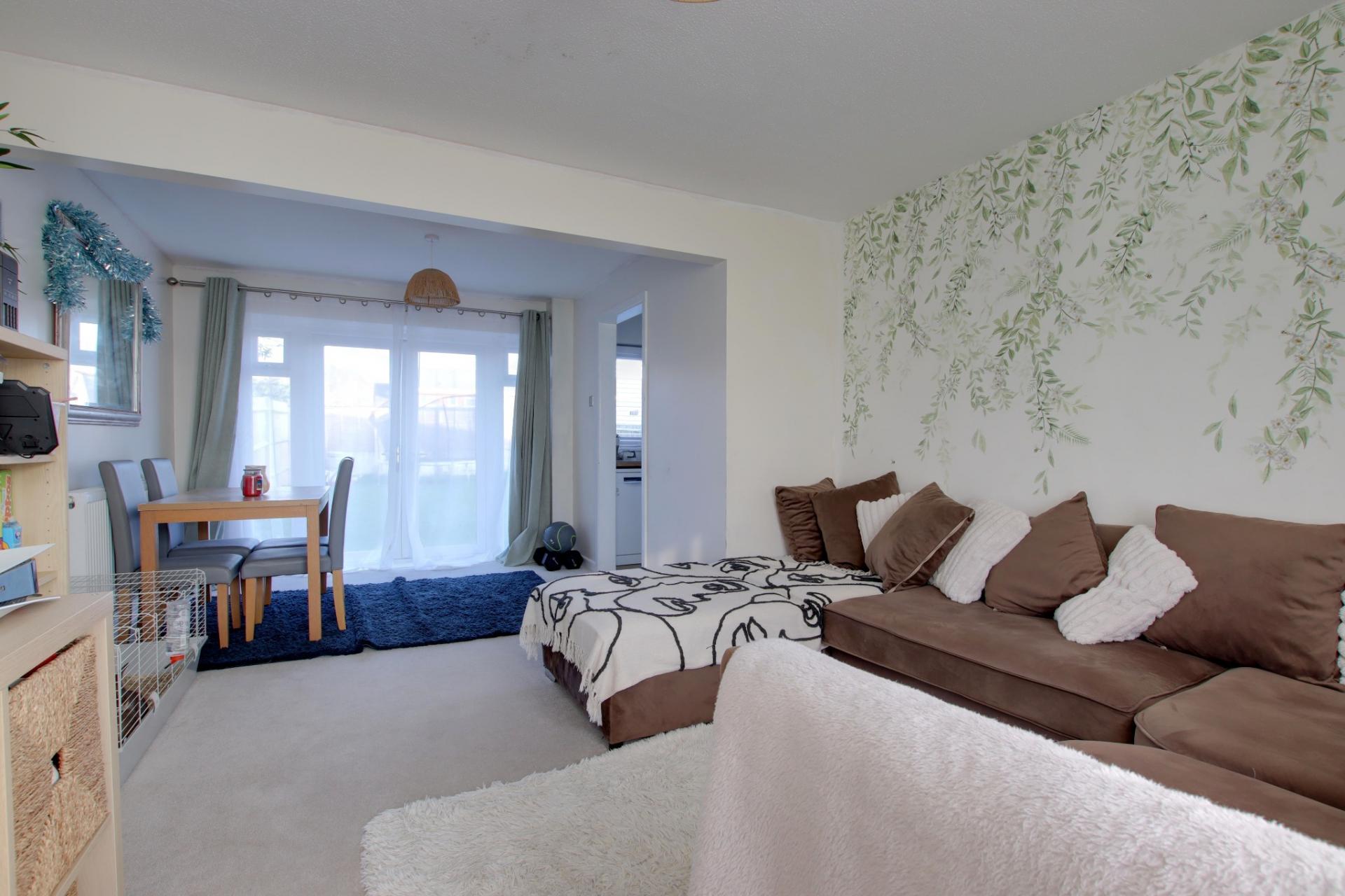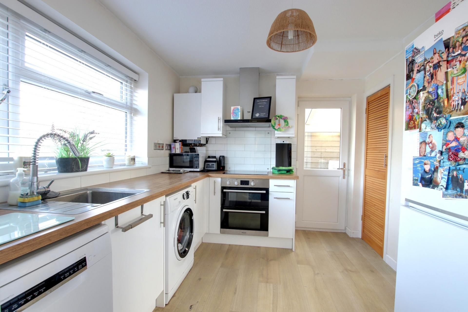 Double glazed window overlooking the rear garden. Range of fitted base and floor cupboards with roll edge working surfaces over and sink unit inset. Electric hob and electric double oven with extractor hood above. Space for washing machine, dishwasher and fridge/freezer. Wall mounted gas boiler (approximately two years old) serving the central heating and domestic hot water. Built-in understairs storage cupboard. Opening to lounge/diner and door to: