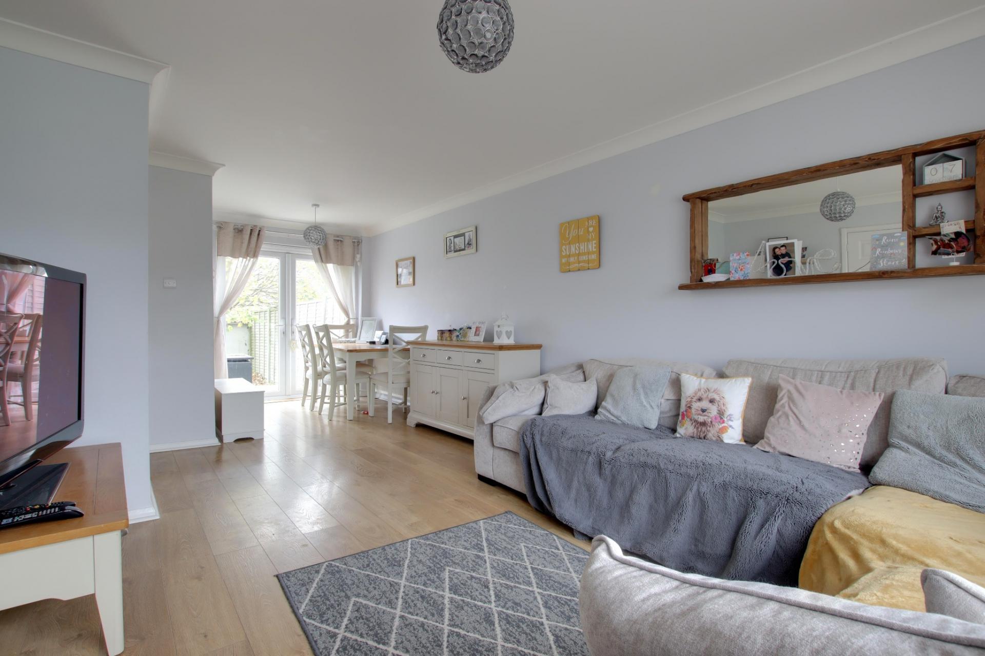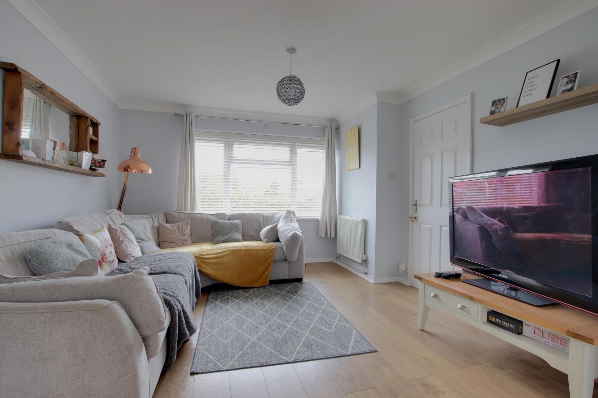 Double glazed window to front and double glazed French doors leading to the rear garden. Smooth and coved ceiling. Two radiators. Wood effect laminate flooring.