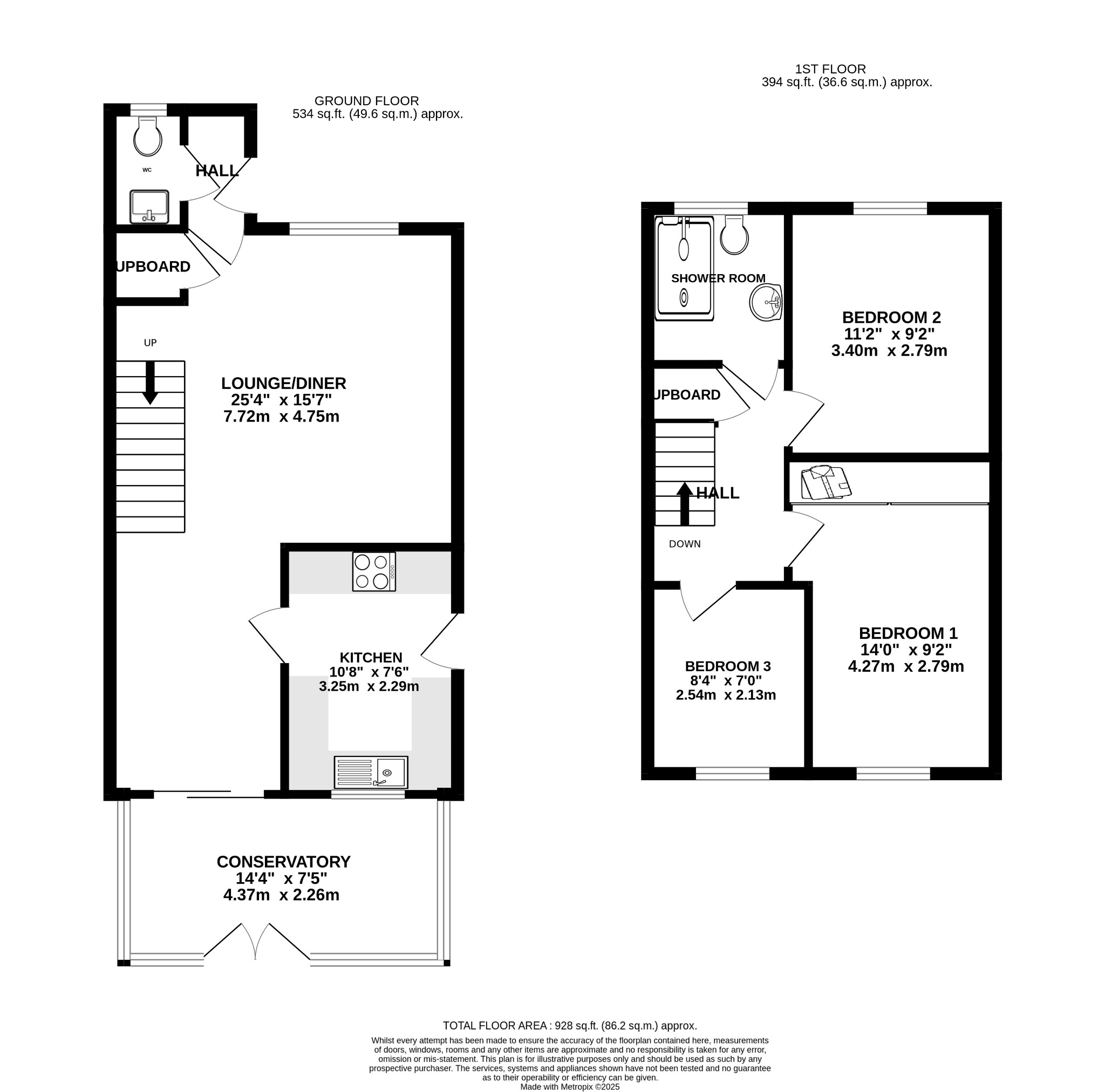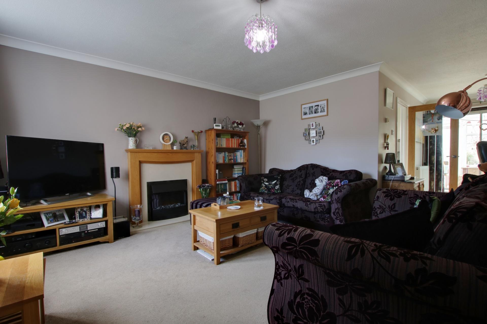 Double glazed window to front elevation and patio doors to conservatory. Feature fireplace with coal effect electric fire. Coved and textured ceiling. Two radiators. Stairs to first floor. Storage cupboard.