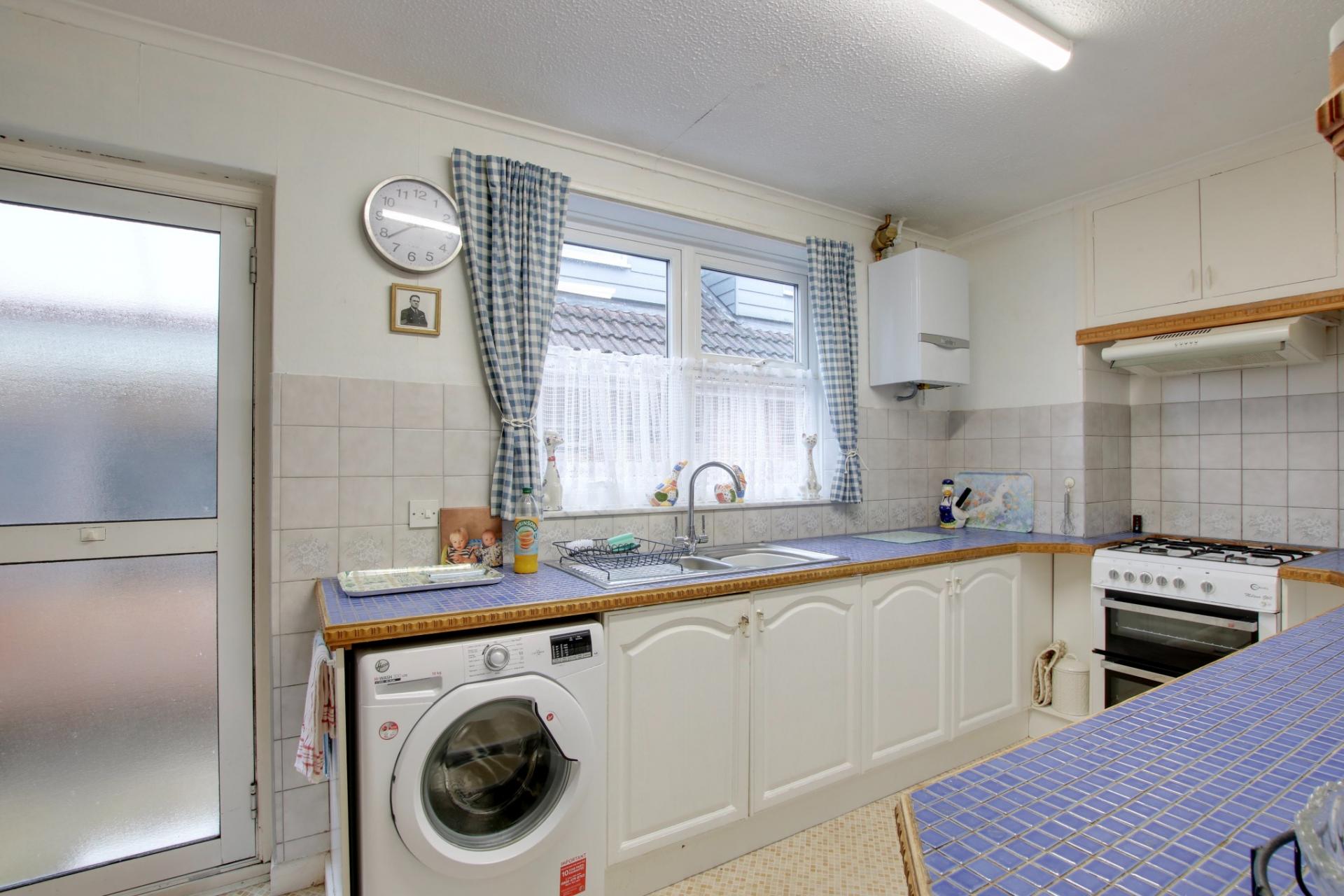 Double glazed window to side elevation. Kitchen comprising one and a half bowl stainless steel single drainer sink unit with cupboard under. Further range of wall and base level units with wooden edged work surfaces over and splash back tiling. Gas oven (to remain) with cooker hood over. Plumbing for washing machine and space for fridge/freezer. Double glazed door to side driveway.