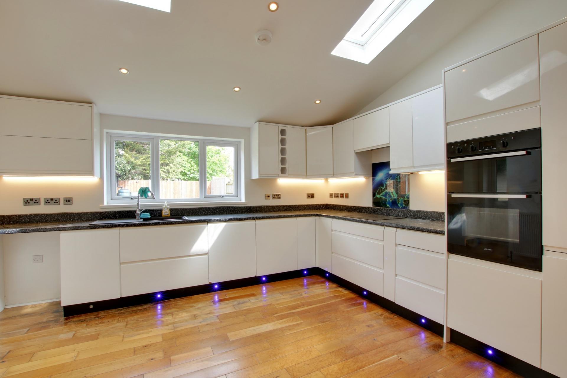 A spacious extended room which has double glazed windows to rear elevation and a part vaulted ceiling with double glazed 'Velux' windows allowing ample natural light. The kitchen has a comprehensive range of wall and base level units with integrated sink unit and water softener. There is a built-in and concealed dishwasher. Plumbing for washing machine. Built-in four ring ceramic hob. Fitted electric double oven with cupboards under and over. Wooden flooring. Airing for dining table. Two radiators. Oak door to WC and double glazed door to outside.