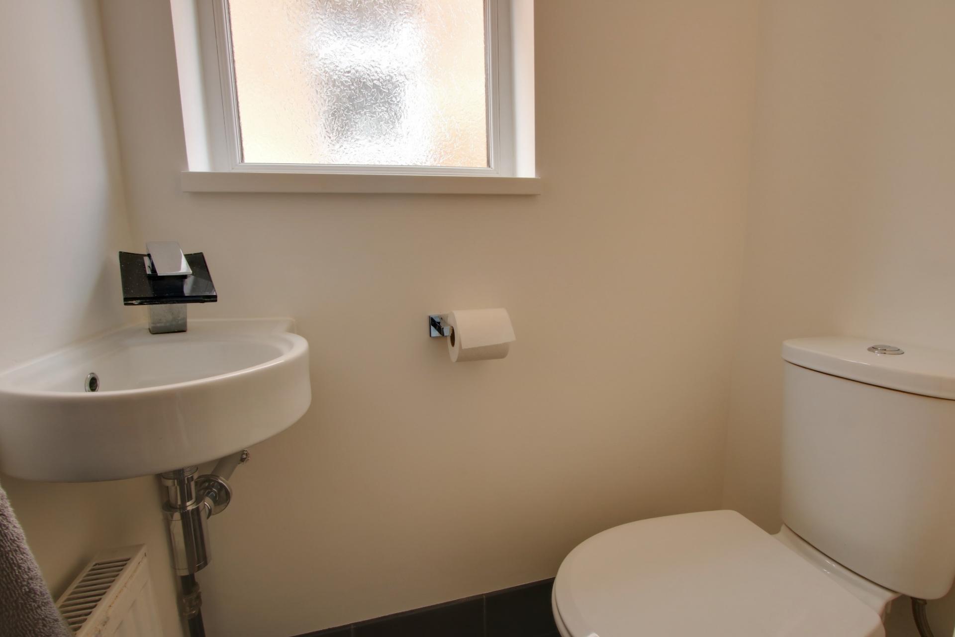Double glazed window to side elevation. Low level close coupled WC. Corner wash hand basin. Radiator. Tiled walls.