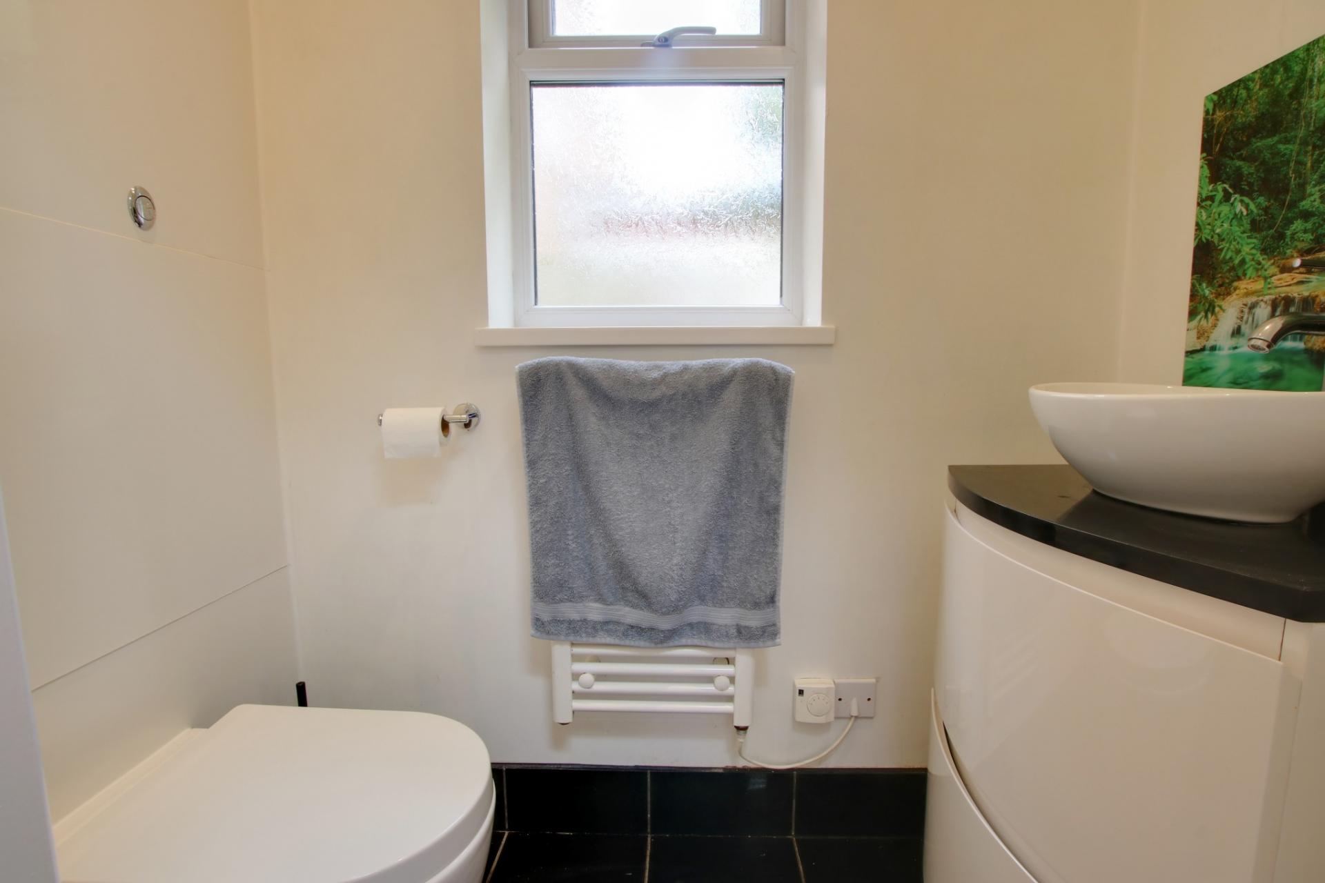Double glazed window to side elevation. Low level close coupled WC. Table top wash hand basin with storage beneath. Heated towel rail. Tiled flooring.