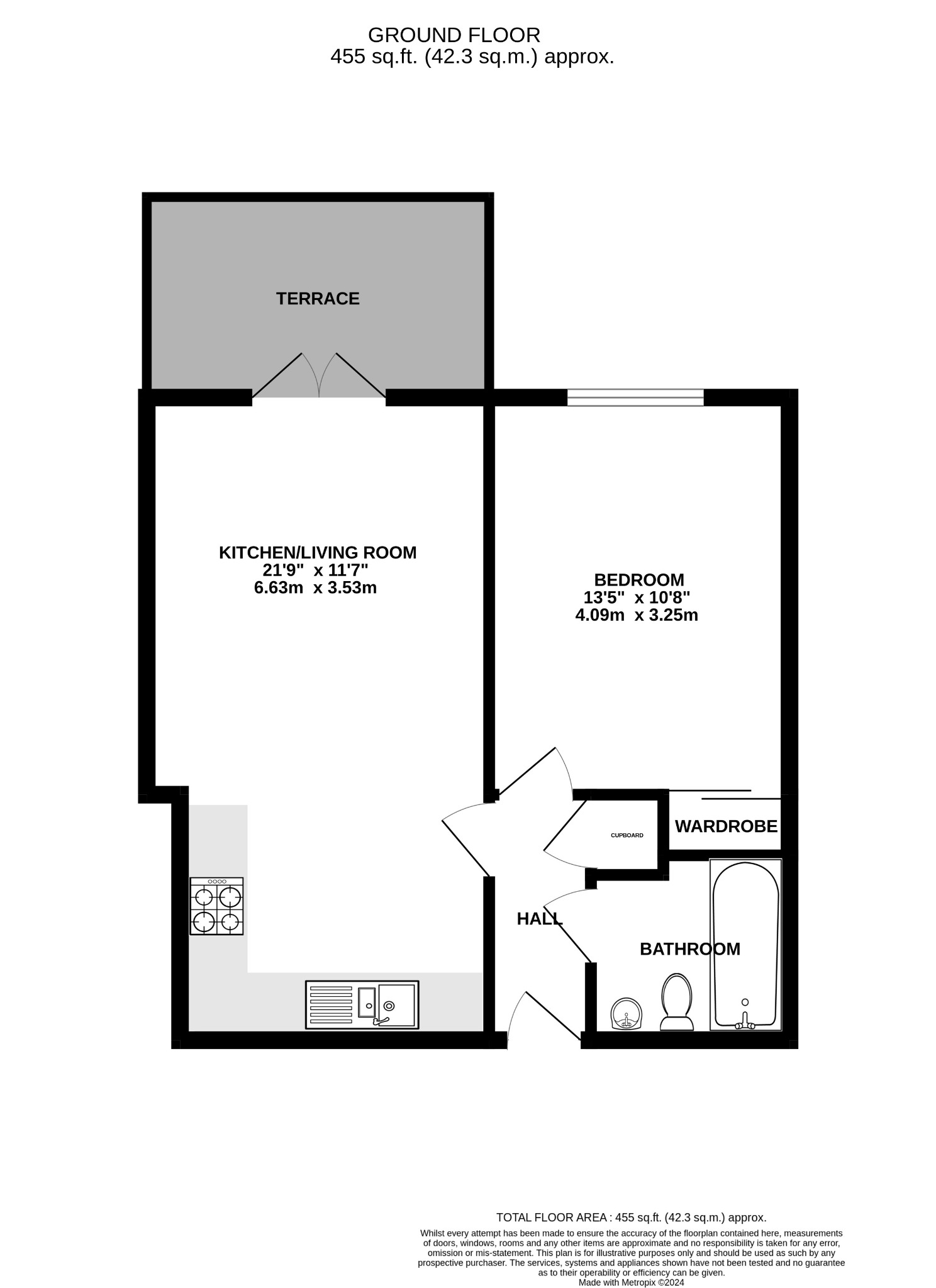 NO FORWARD CHAIN. A one bedroom ground floor apartment with its own terrace, which is accessed through French doors from the living room. The property's accommodation briefly comprises; communal entrance hall, a private front door to an entrance hall, an open plan living room/kitchen which has double glazed French doors leading to the terrace, one bedroom and a bathroom. The property benefits from double glazing and is warmed by gas central heating. There is secure underground parking for one vehicle. As sole agents we would highly recommend an early inspection.