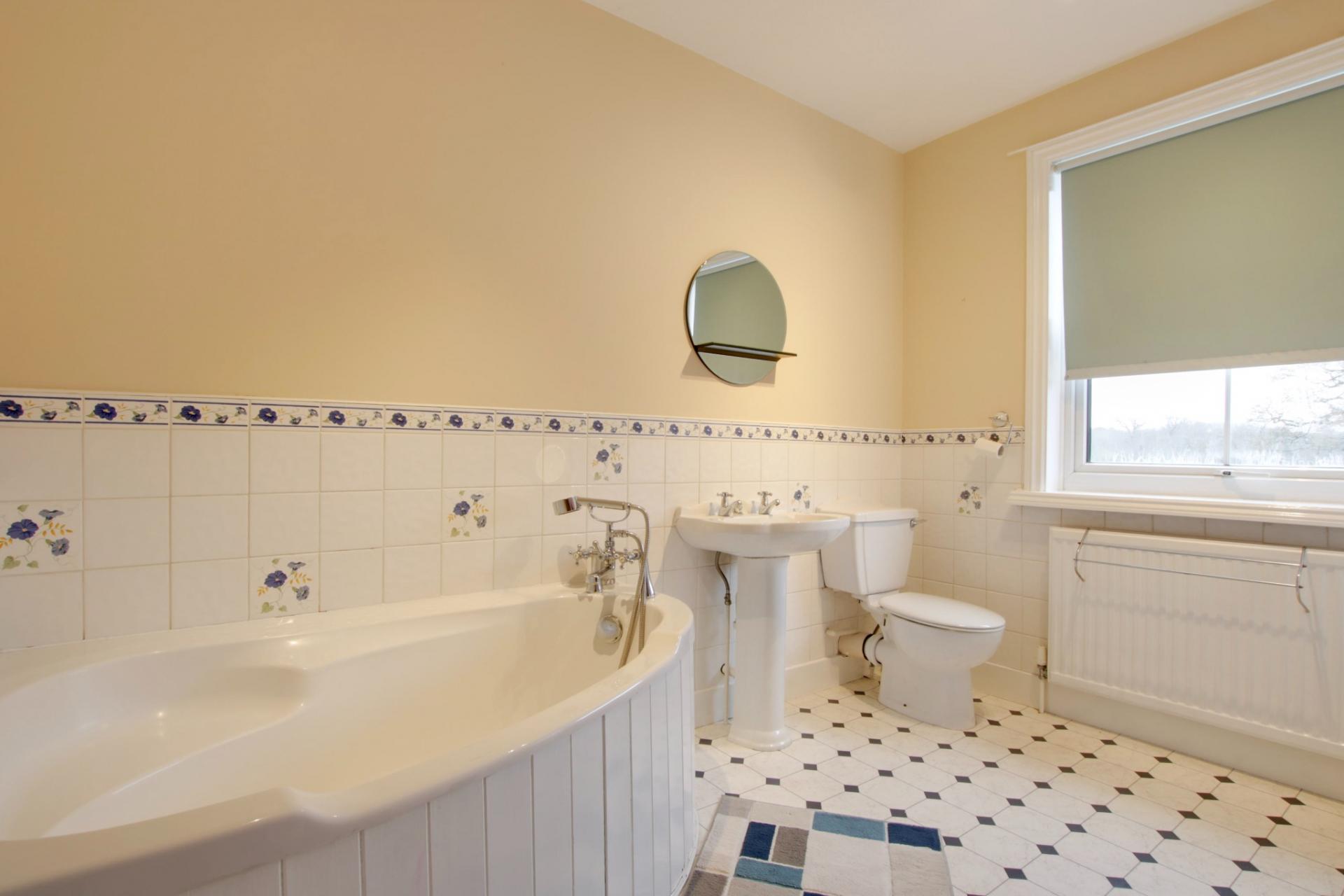 Double glazed window to rear elevation. Corner bath. Pedestal wash hand basin. Low level close coupled WC. Chimney breast with cast iron fireplace. Radiator. Cupboard housing gas boiler.